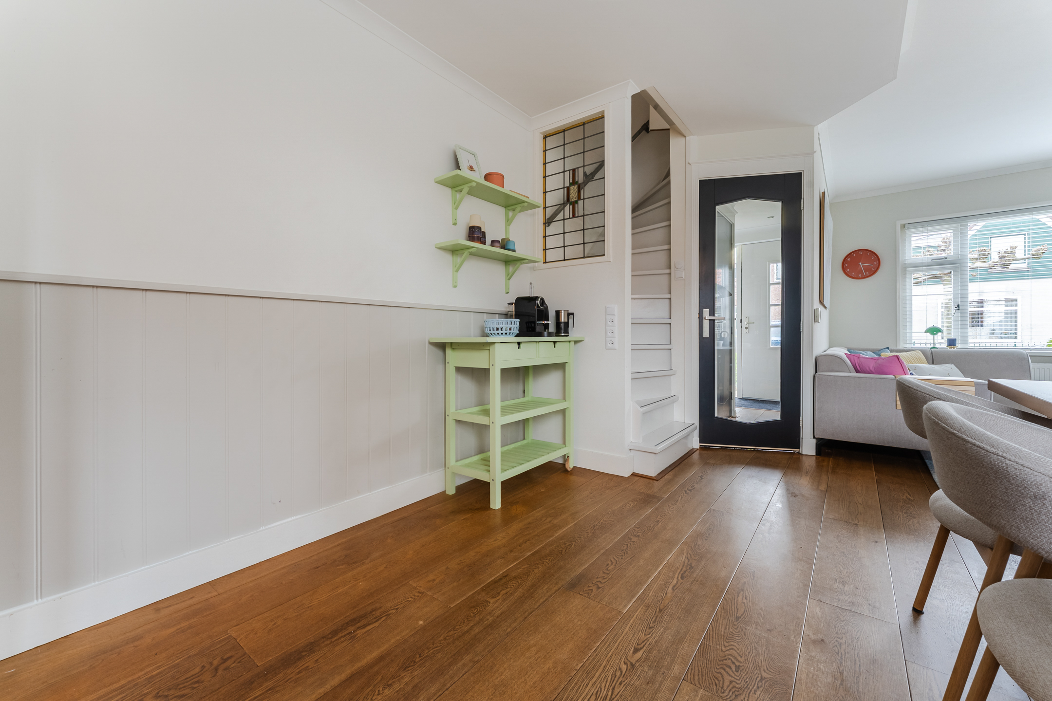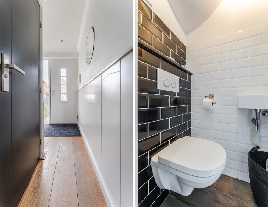 De ruime, bestrate voortuin brengt je naar de voordeur van de woning. Bij binnenkomst word je verwelkomd in de entreehal, die netjes is afgewerkt en wordt verlicht door inbouwspots. Vanuit hier bereik je de meterkast, de toiletruimte met zwevend toilet en fonteintje en de woonkamer.