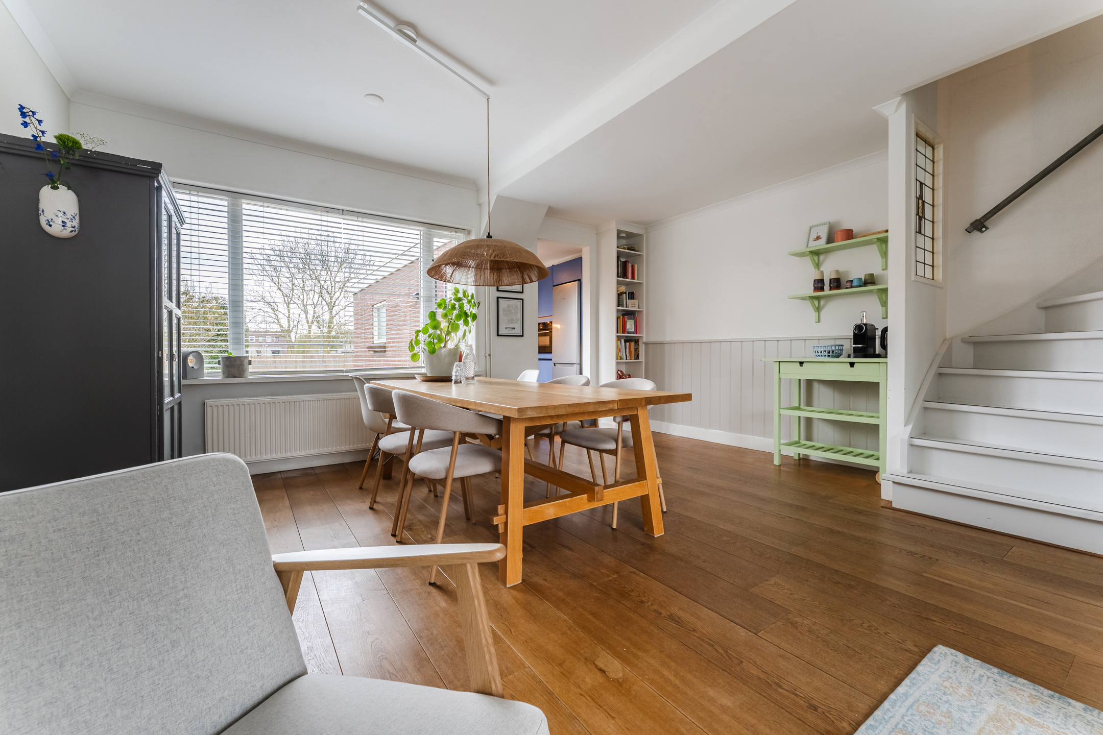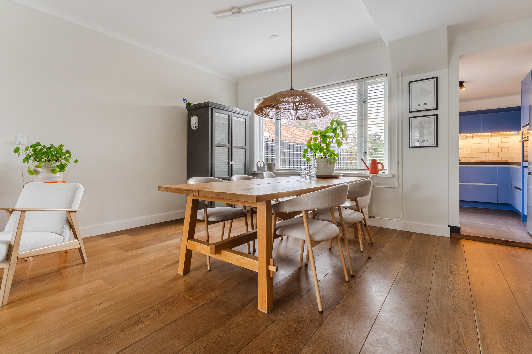 De ruime woonkamer is een oase van licht dankzij de grote raampartijen aan weerszijden. De rustige en nette afwerking op de wanden en de fraaie vloer vormen de perfecte basis voor elk interieur. Via de woonkamer loop je zo de keuken binnen, een echte blikvanger! Uitgevoerd in een stijlvolle diepblauwe kleur en voorzien van moderne inbouwapparatuur, vaatwasser (2024), inductie kookplaat (2024), afzuigkap, combi-oven (2024) en koel-vriescombinatie (2023).