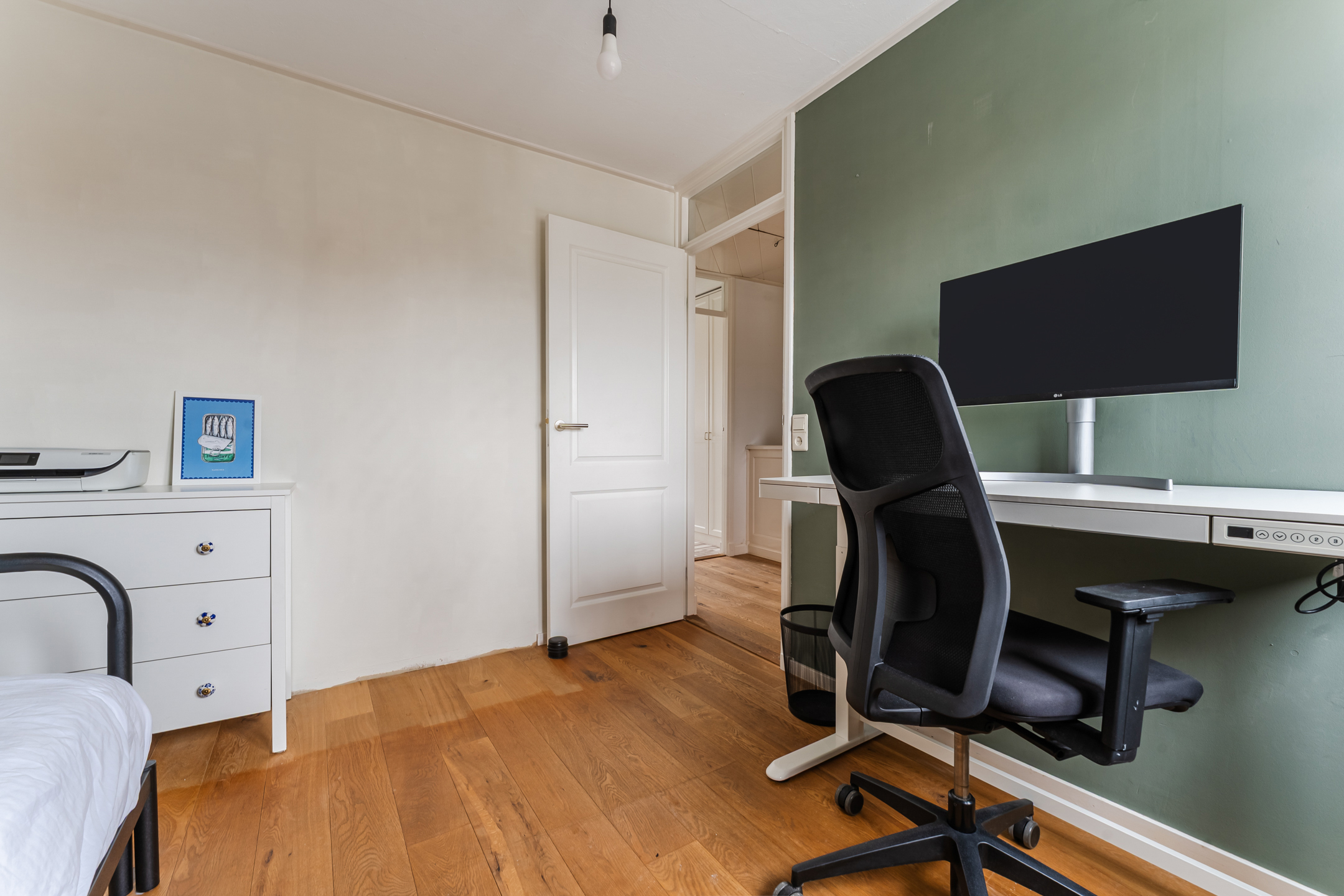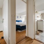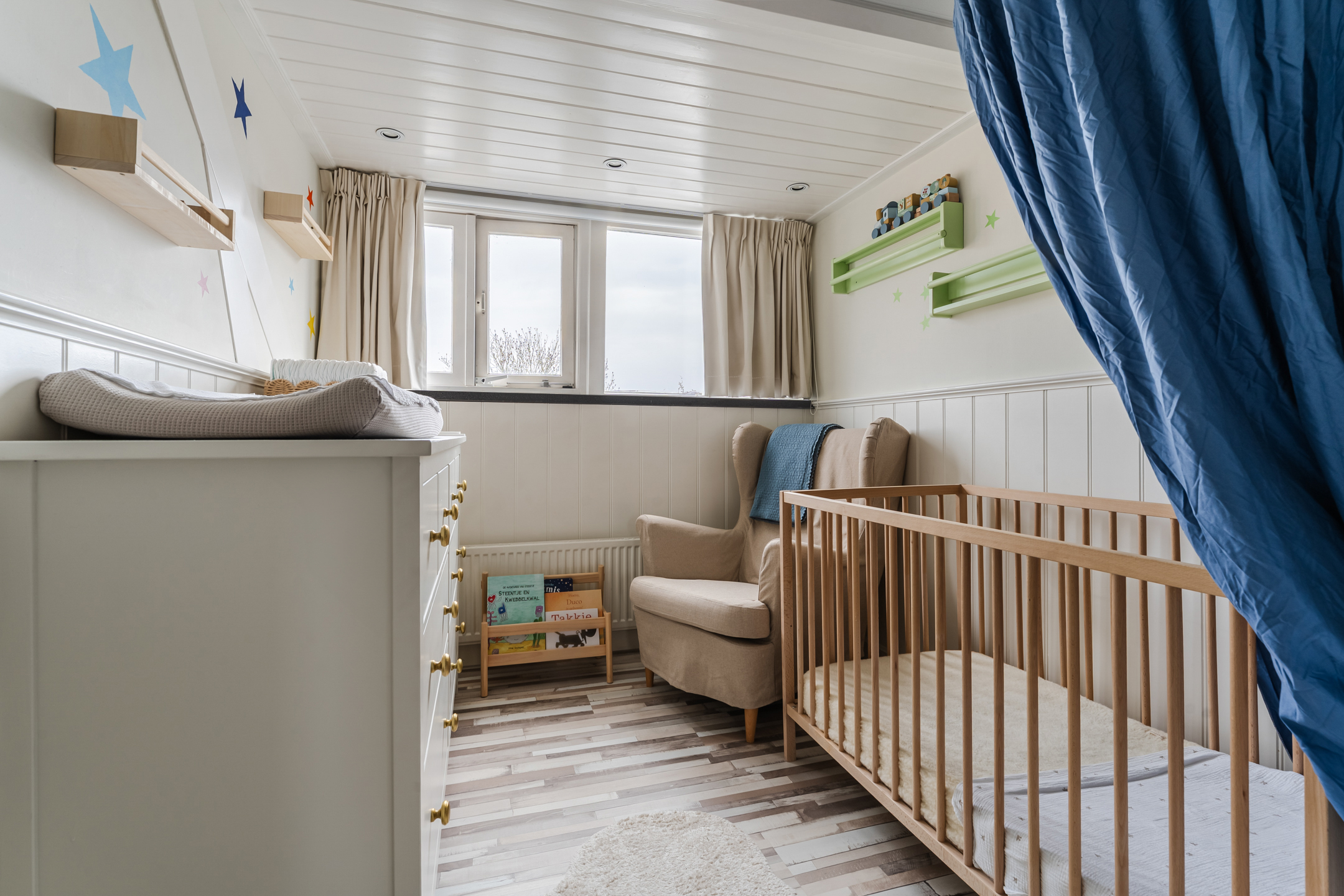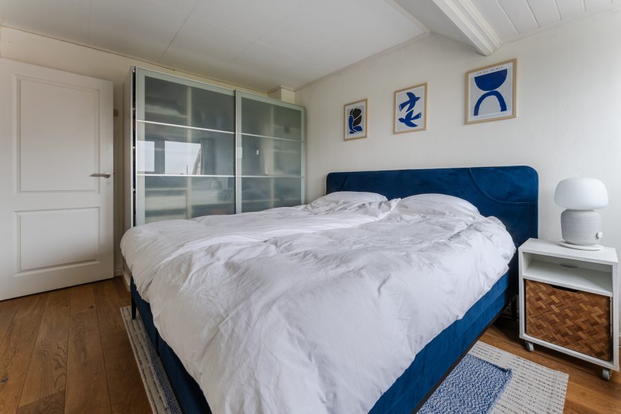 The spacious living room is an oasis of light thanks to large windows on both sides. The calm and neat wall finishes and the beautiful flooring provide the perfect base for any interior. From the living room, you walk straight into the kitchen—a true eye-catcher! Finished in a stylish deep blue color and equipped with modern built-in appliances: dishwasher (2024), induction hob (2024), extractor hood, combi oven (2024), and fridge-freezer (2023).