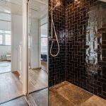 The modern bathroom, approximately 6 years old, is a place to fully unwind. It has a contemporary look and is finished with a combination of light and dark tiles. Here you will also find a wall-mounted toilet, vanity unit with washbasin, wall cabinet, design radiator, and a walk-in shower. Recessed lighting completes the space.