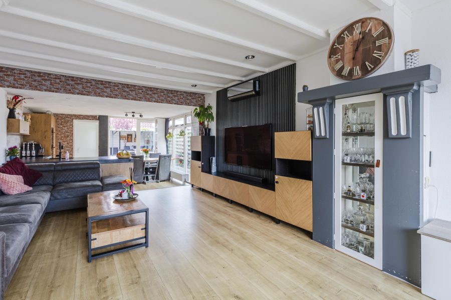 De woonkamer is uitgebouwd en daardoor zeer ruim opgezet. Deze ruimte is sfeervol ingericht en voorzien van een lichte vloer en strakke wanden. De grote ramen en openslaande tuindeuren maken de woonkamer heerlijk licht. In de woonruimte is airconditioning aanwezig.