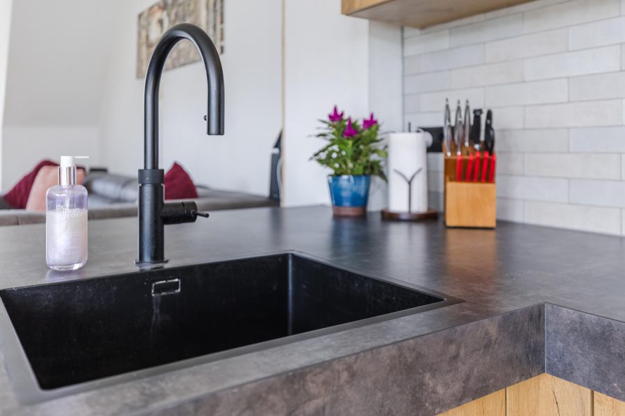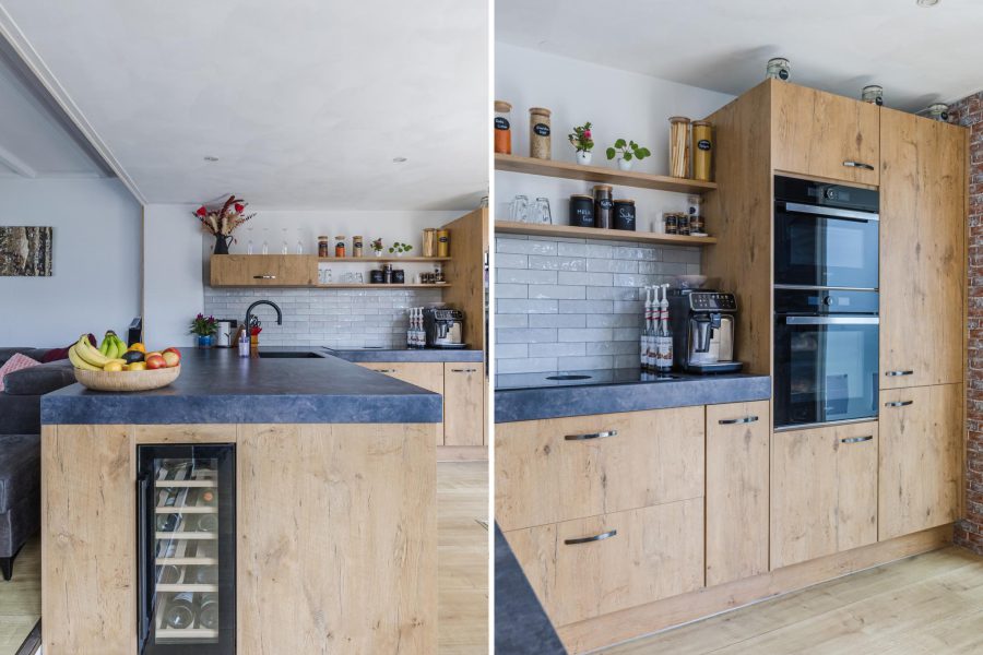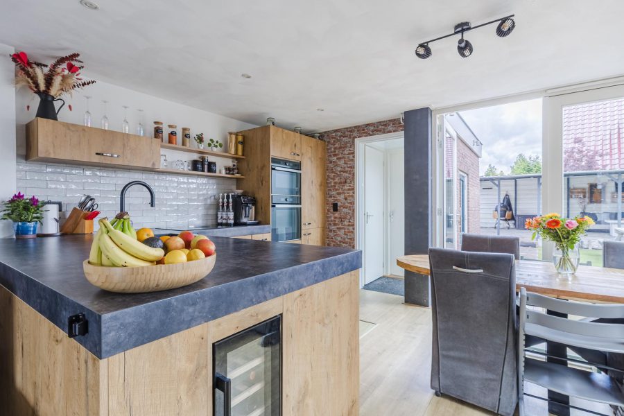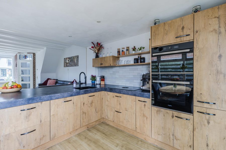 Aan de achterzijde van de woonkamer bevindt zich de prachtige open keuken. De keuken is in 2022 vernieuwd en uitgevoerd in een hoekopstelling met houtkleurige keukenkastjes en een donker werkblad. De keuken is uitgerust met moderne inbouwapparatuur, waaronder een inductie kookplaat met afzuiging, ovens, vaatwasser, wijnklimaatkast, koelkast, vriezer en Quooker. De keuken wordt verlicht met inbouwspots.