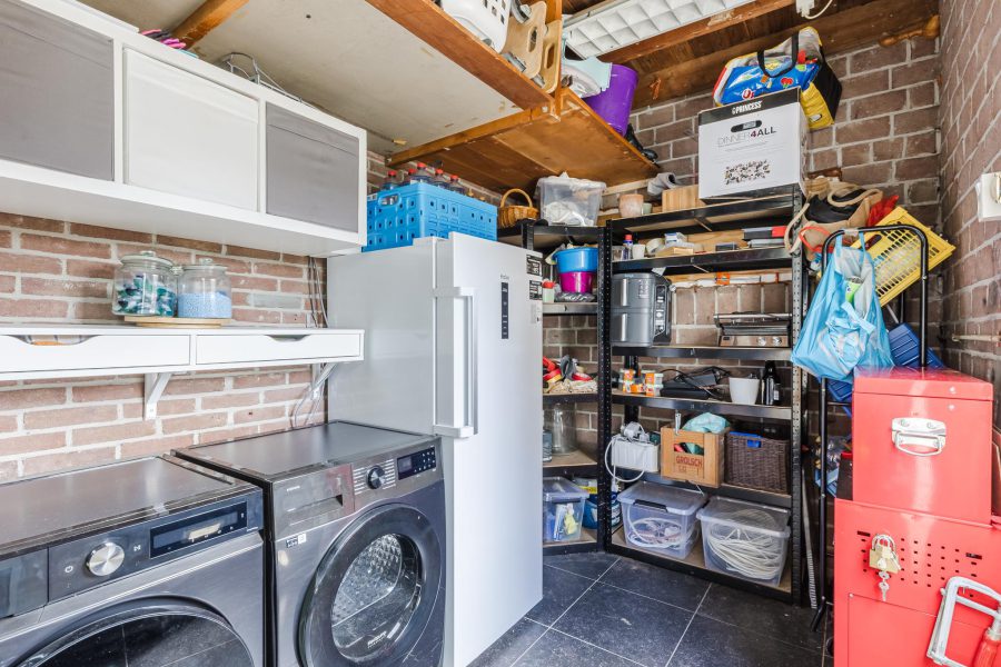 Via de keuken loop je zo een kleine hal binnen. Deze hal biedt toegang tot een berging en een toiletruimte met staand toilet en fonteintje. In de berging bevinden zich de aansluitingen voor de wasmachine en de droger. Bovendien is er ruimte om spullen op te bergen.