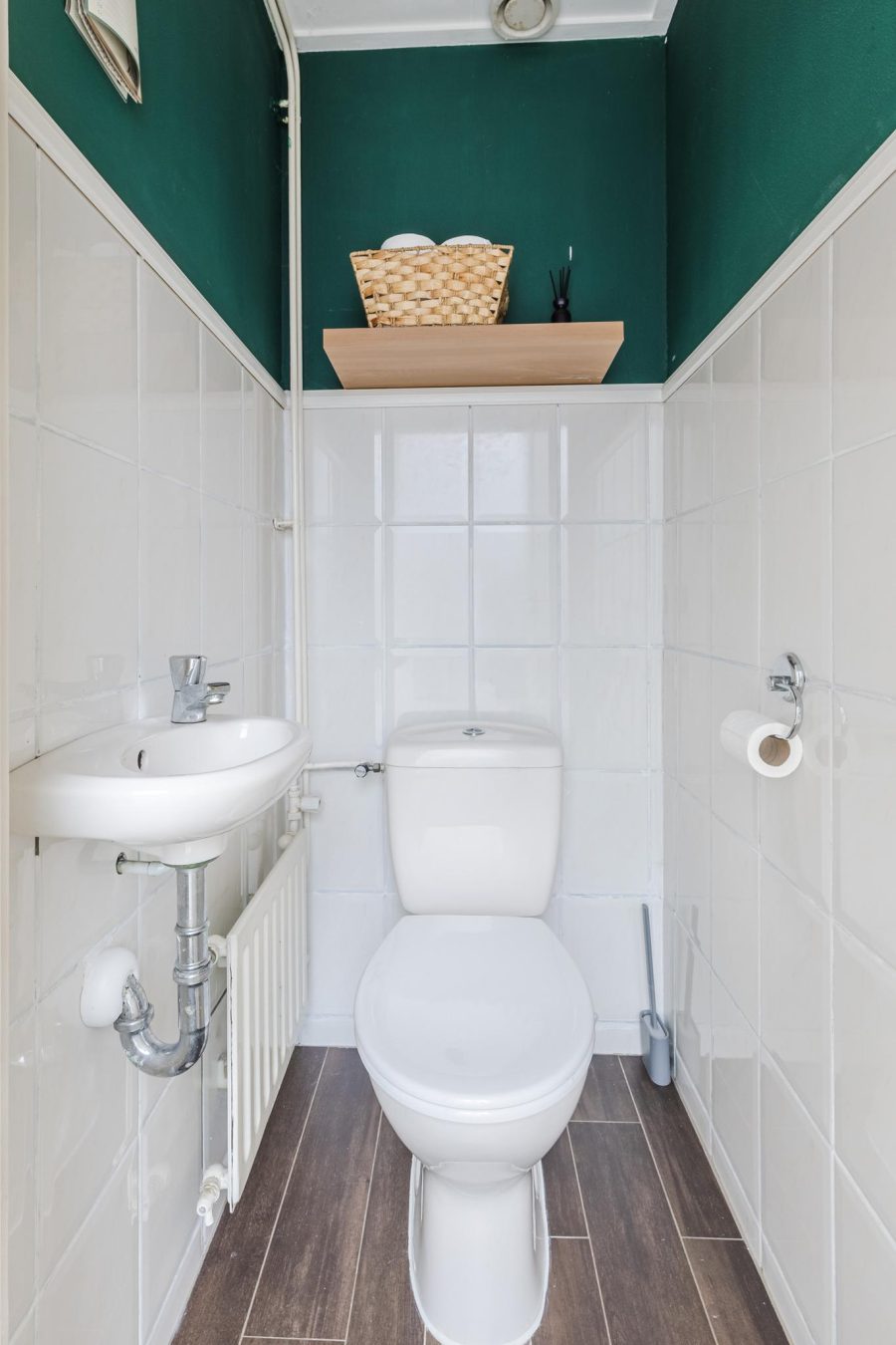 From the kitchen, you walk into a small hallway. This hallway provides access to a storage room and a toilet with a standing toilet and hand basin. The storage room contains the washer and dryer connections, with additional space for storage.