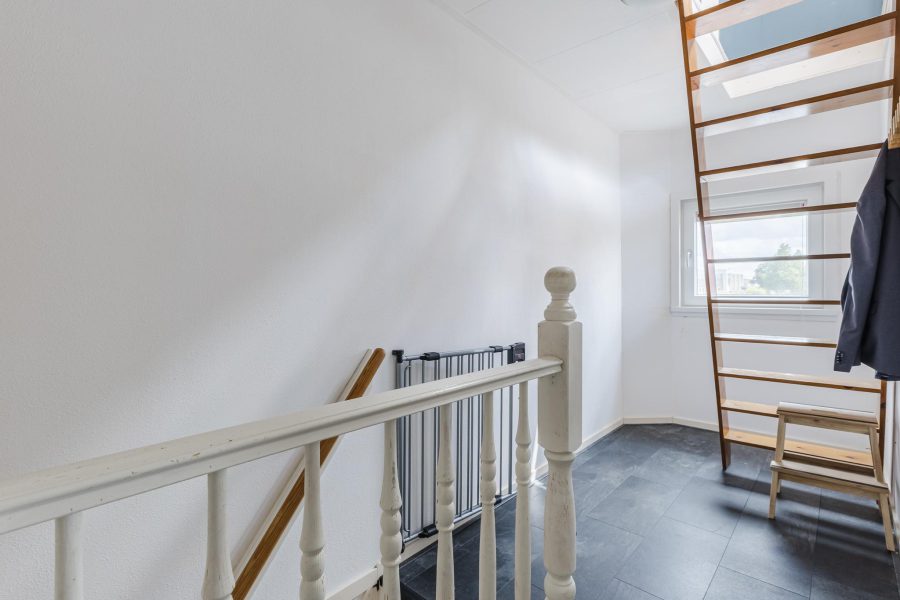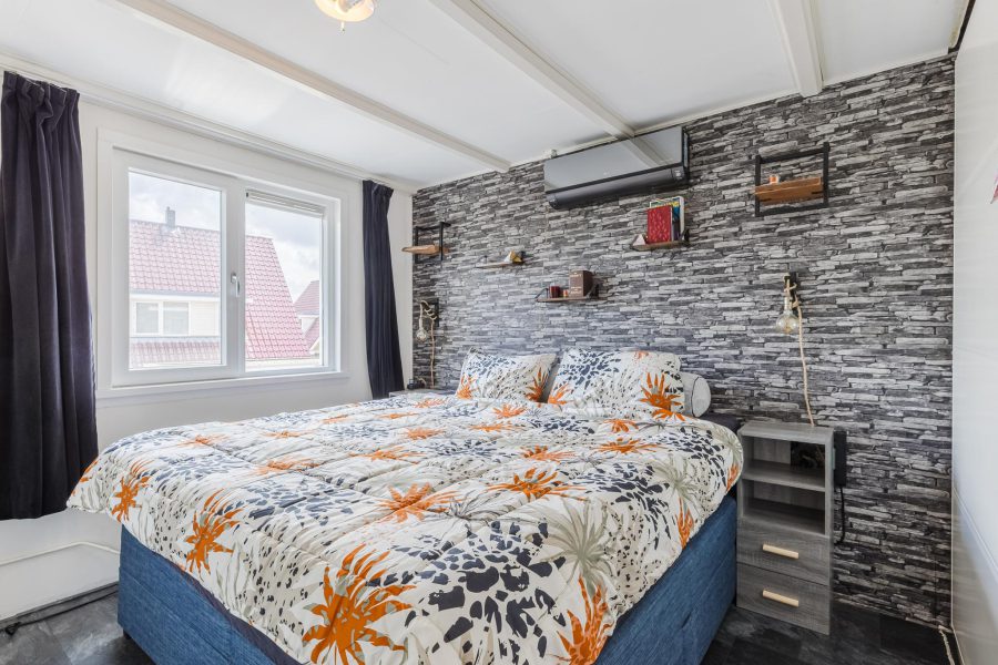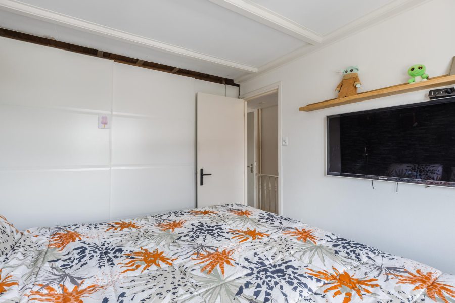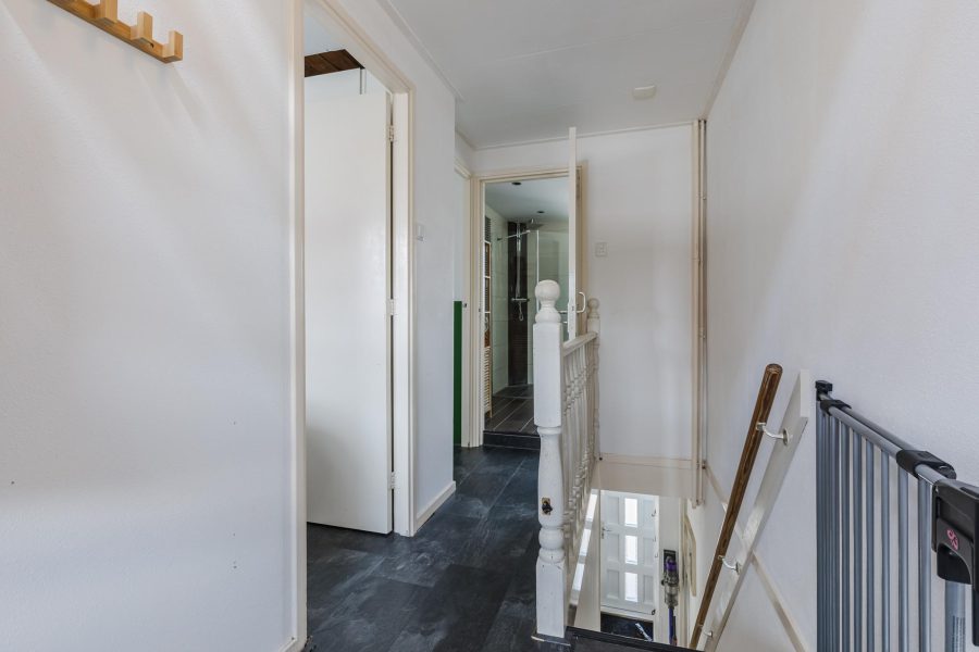 De trap in de entreehal biedt toegang tot de ruime overloop van de eerste verdieping. Op deze verdieping vind je de trap naar de tweede verdieping, twee slaapkamers en een badkamer. Van de twee grote slaapkamers ligt er één aan de voorzijde en één aan de achterzijde. Beide kamers zijn fraai afgewerkt, heerlijk licht en voorzien van airconditioning.