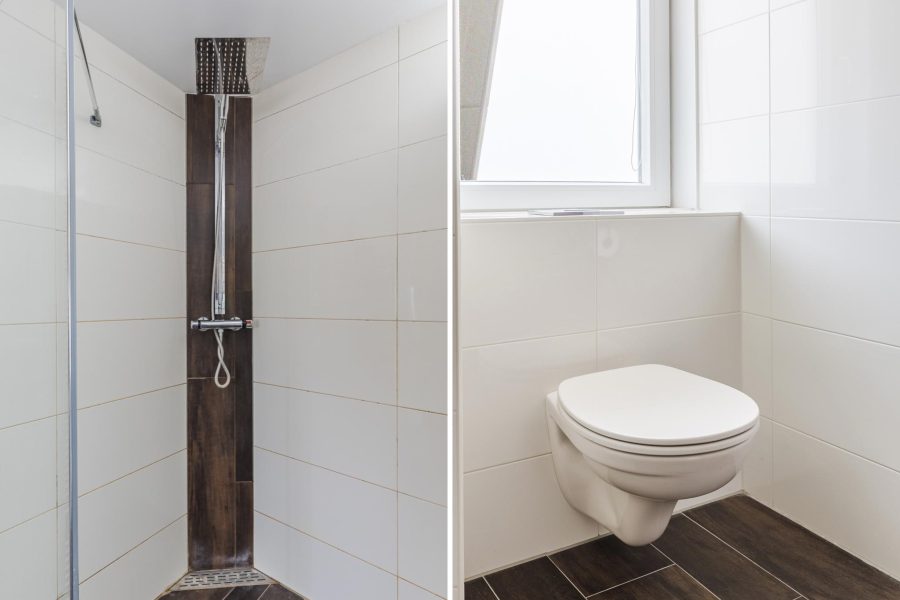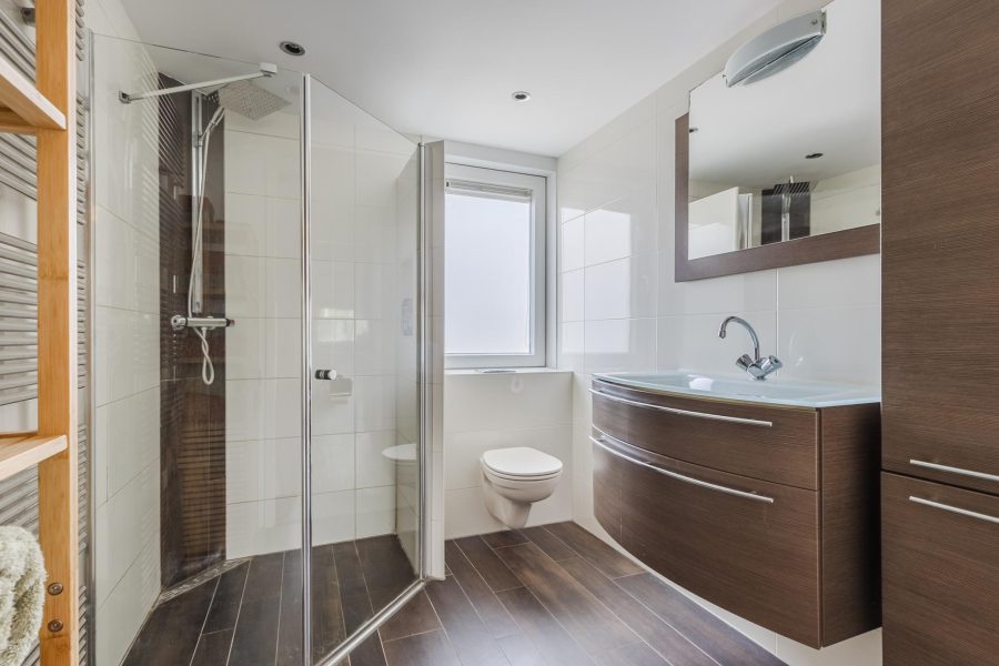 De royale badkamer heeft een luxe uitstraling en is uitgerust met een zwevend toilet, badmeubel met wastafel en moderne douchecabine met regendouche. De ruimte wordt verlicht met spotjes.