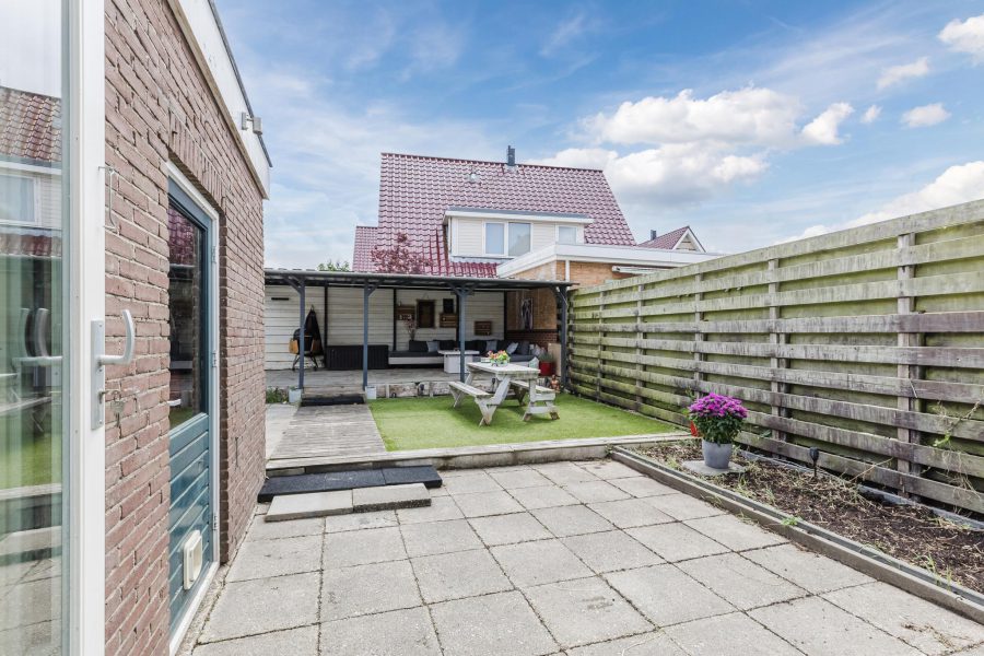 Het huis beschikt over een diepe en fraai aangelegde tuin. Dit is een heerlijke plek voor liefhebbers van het buitenleven. De tuin bestaat uit zowel tegels als groen en is sfeervol ingericht. Genieten van het zonnetje doe je hier in alle rust, want de tuin is rondom uitstekend beschut. Liever overdekt loungen? Dat kan ook, want er is een grote overkapping aanwezig.