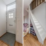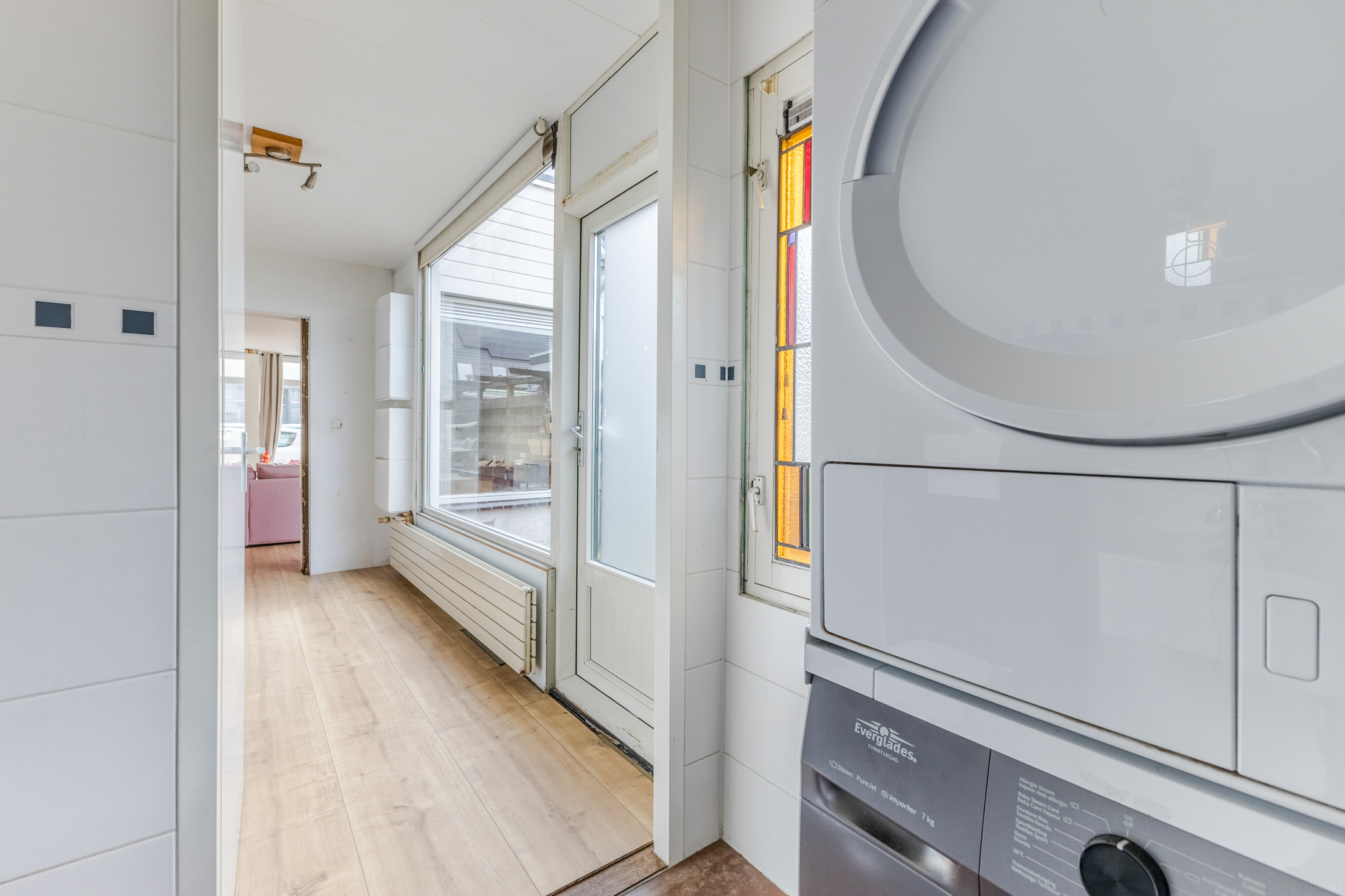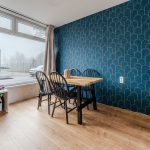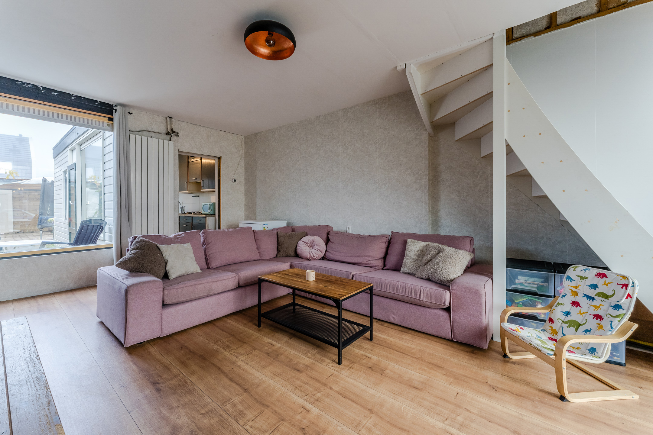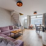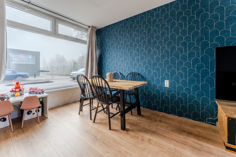 The front door of this house is accessible from the street. Upon entering, you will find yourself almost immediately in the living room. Here you will find the stairs to the first floor. The living room has neat flooring and the walls are finished in a calm and striking color. Thanks to the wide window at both the front and back, the living room is wonderfully light.