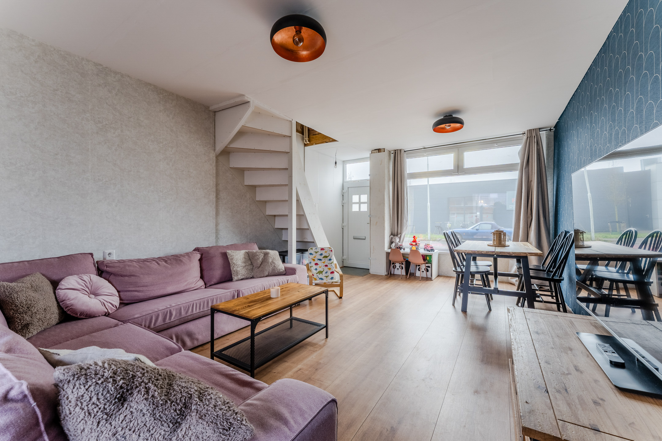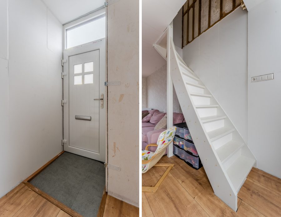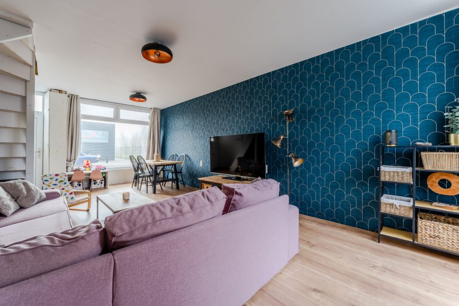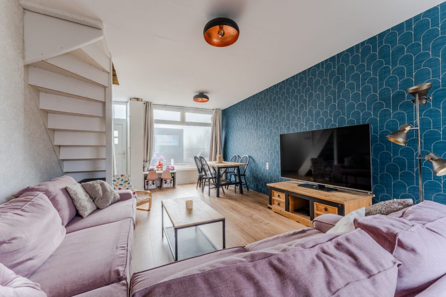 Via de straat bereik je de voordeur van deze woning. Na binnenkomst kom je vrijwel direct in de woonkamer terecht. Hier bevindt zich de trap naar de eerste verdieping. De woonkamer is voorzien van een nette vloer en de wanden zijn uitgevoerd in een rustige en een opvallende kleur. Dankzij de brede raampartij aan zowel de voor- als achterzijde is de living heerlijk licht.