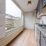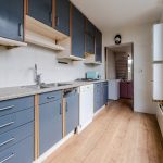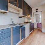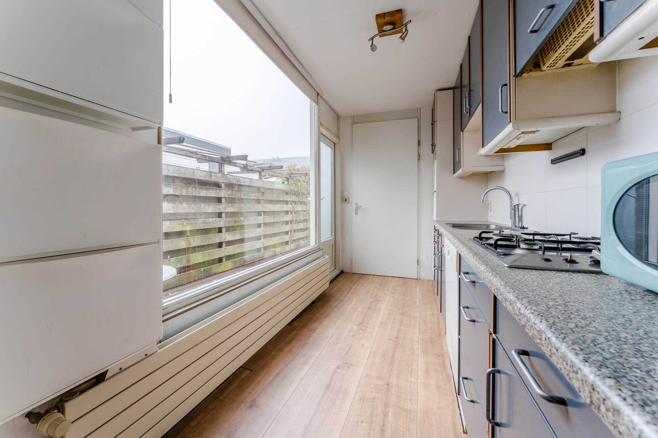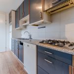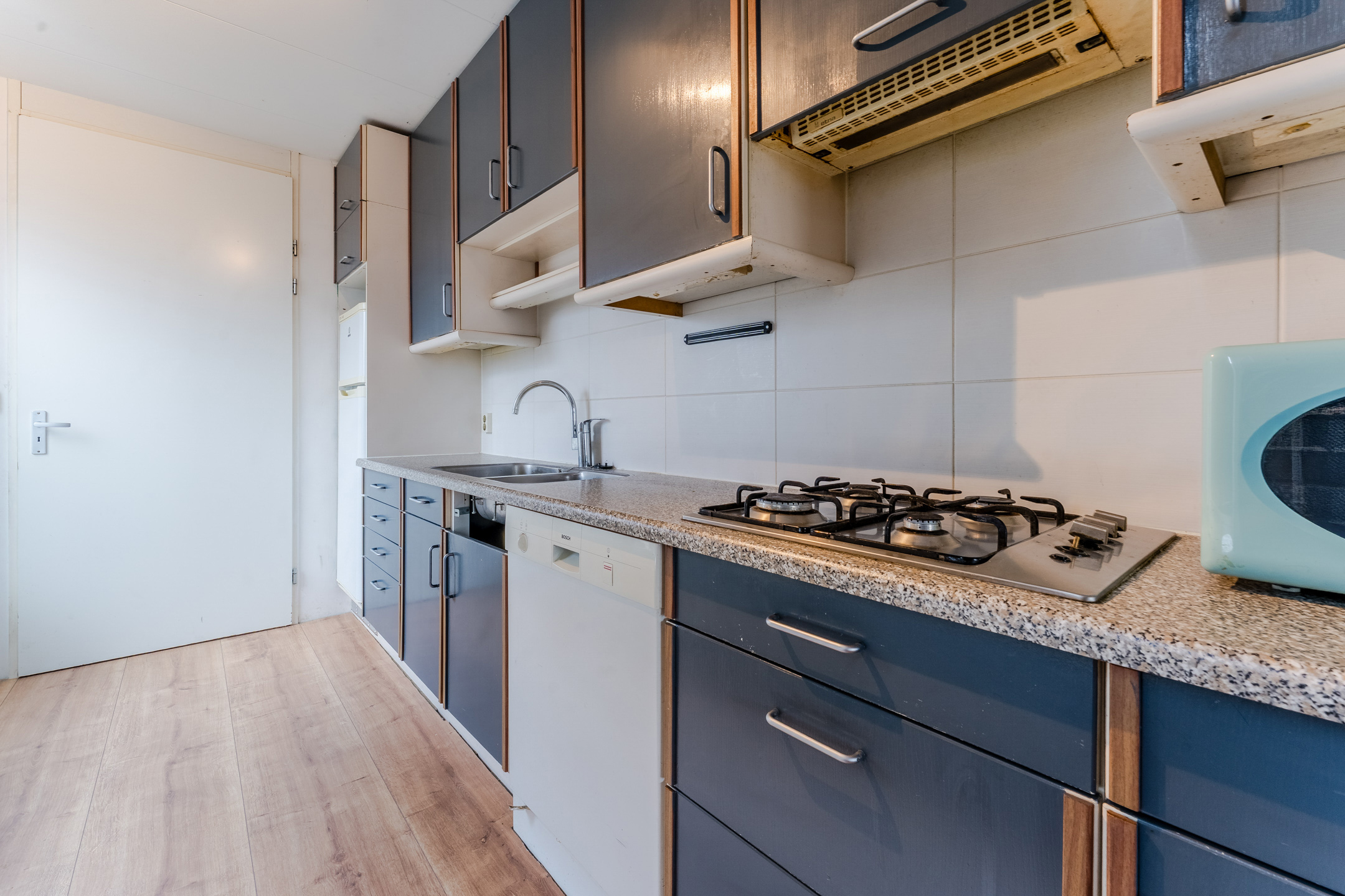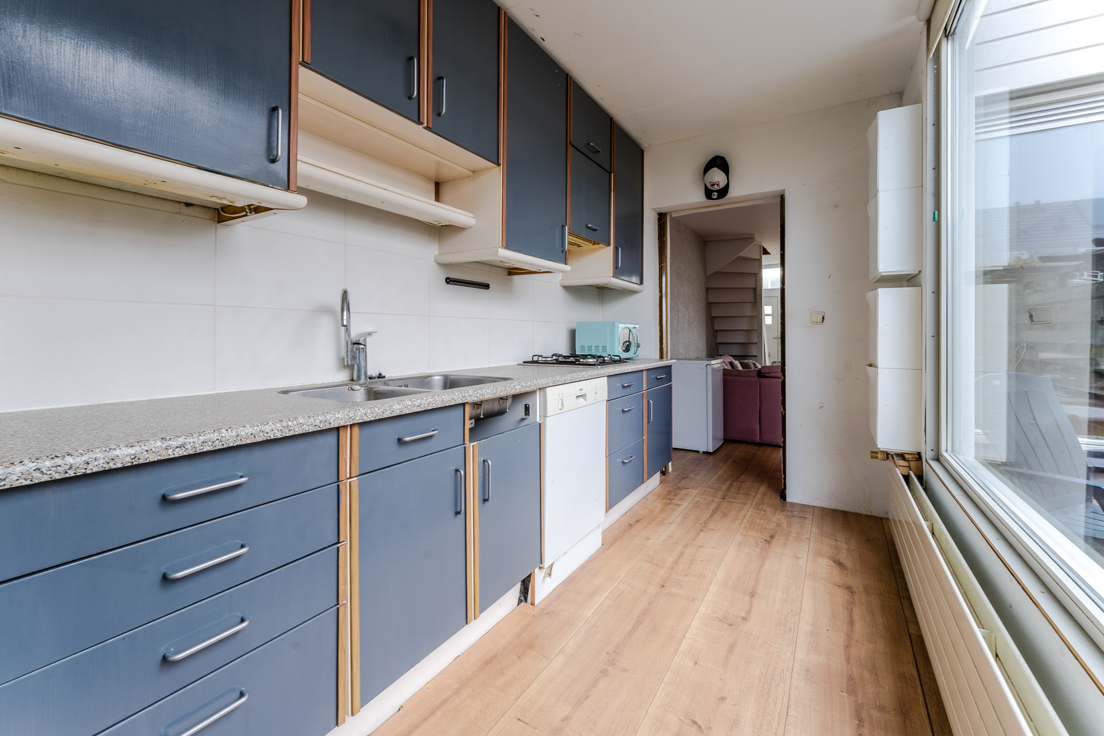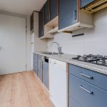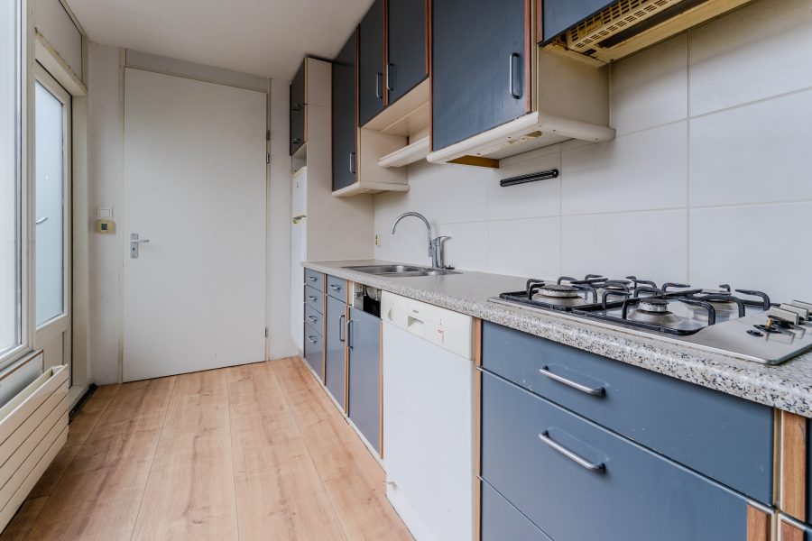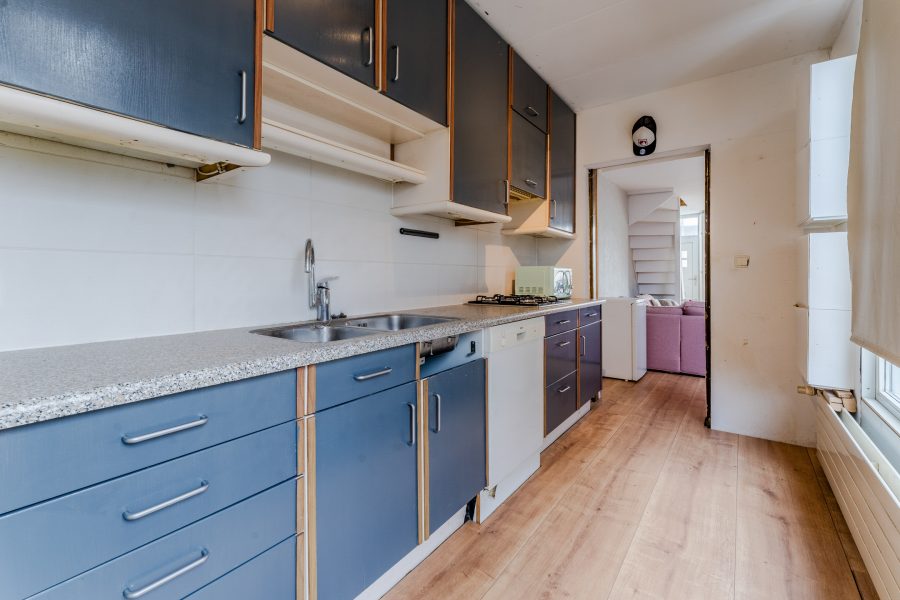 De keuken is gedateerd en uitgevoerd in een rechte opstelling. Het heeft donkerblauwe keukenkastjes en een gespikkeld werkblad. Hier tref je momenteel de volgende apparatuur aan: gasfornuis, vaatwasser en koelkast. Het grote raam zorgt voor veel daglicht tijdens het koken. De keuken geeft toegang tot de achtertuin en de badkamer.