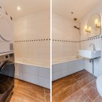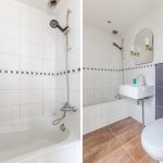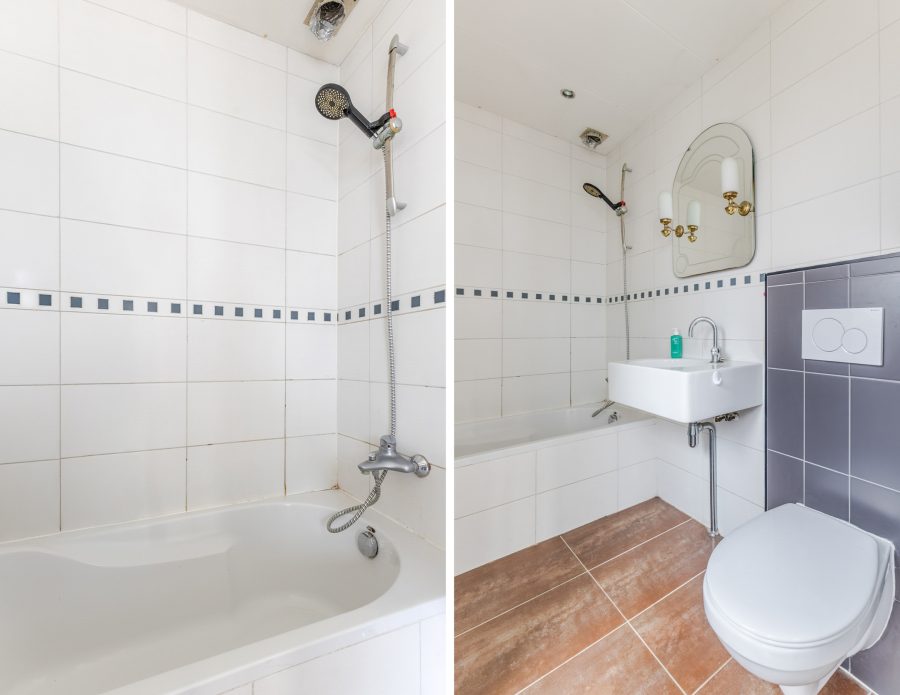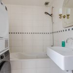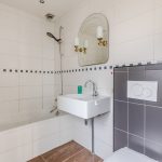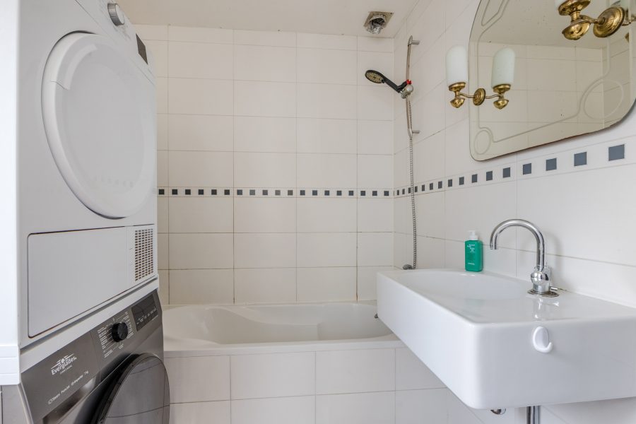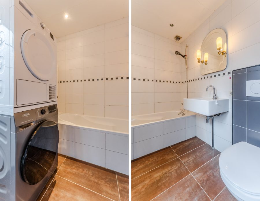 De badkamer is afgewerkt met bruine vloertegels en witte wandtegels. De ruimte is uitgerust met een zwevend toilet (2024), wastafel, ligbad en aansluitingen voor de wasmachine en droger. De badkamer wordt verlicht met inbouwspots.