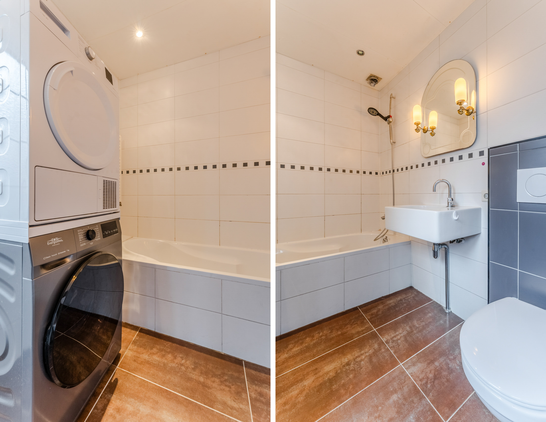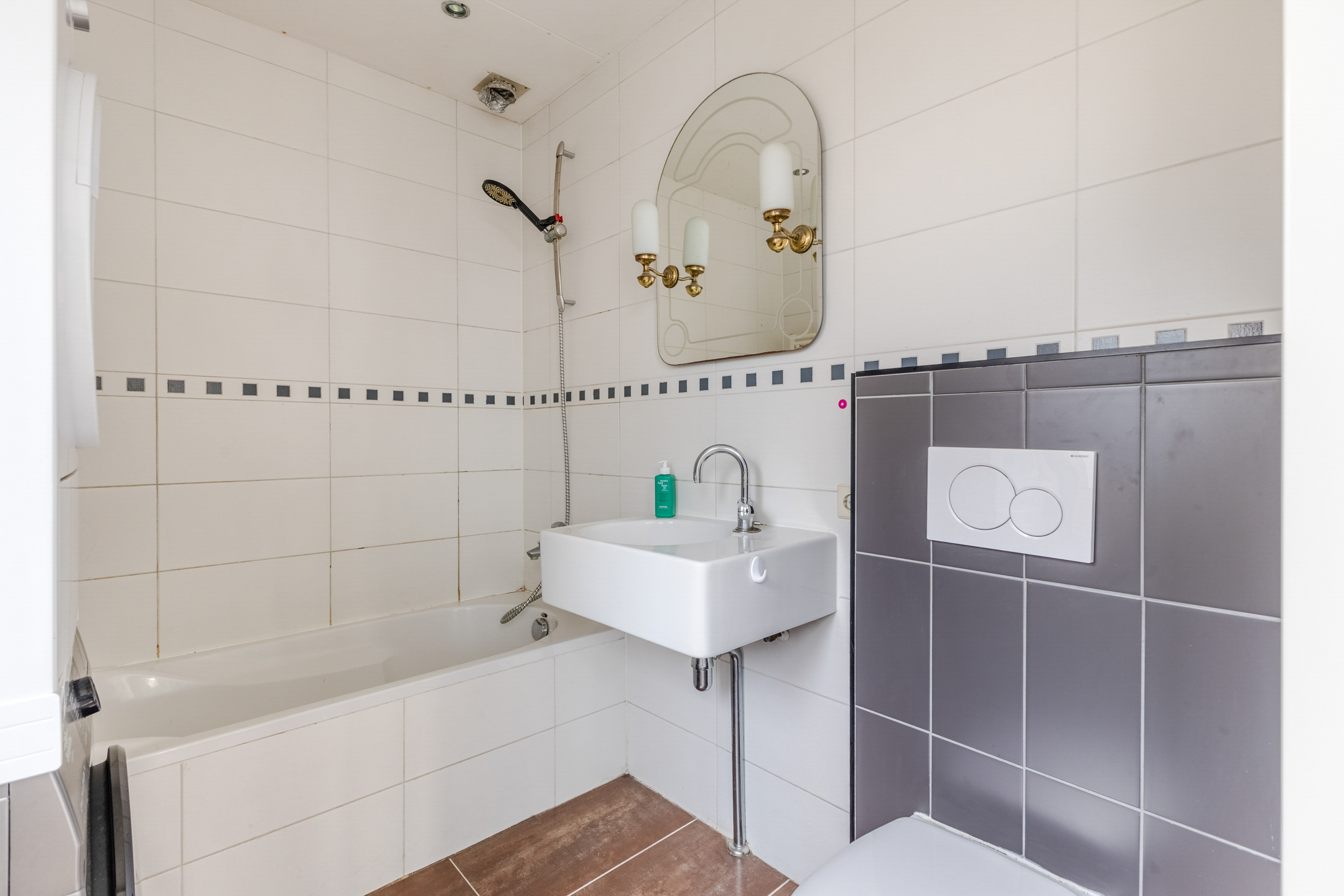 In the bathroom you will find brown floor tiles and white wall tiles. The room is equipped with a floating toilet (2024), sink, bathtub and connections for the washing machine and dryer. The bathroom is lit with recessed spotlights.