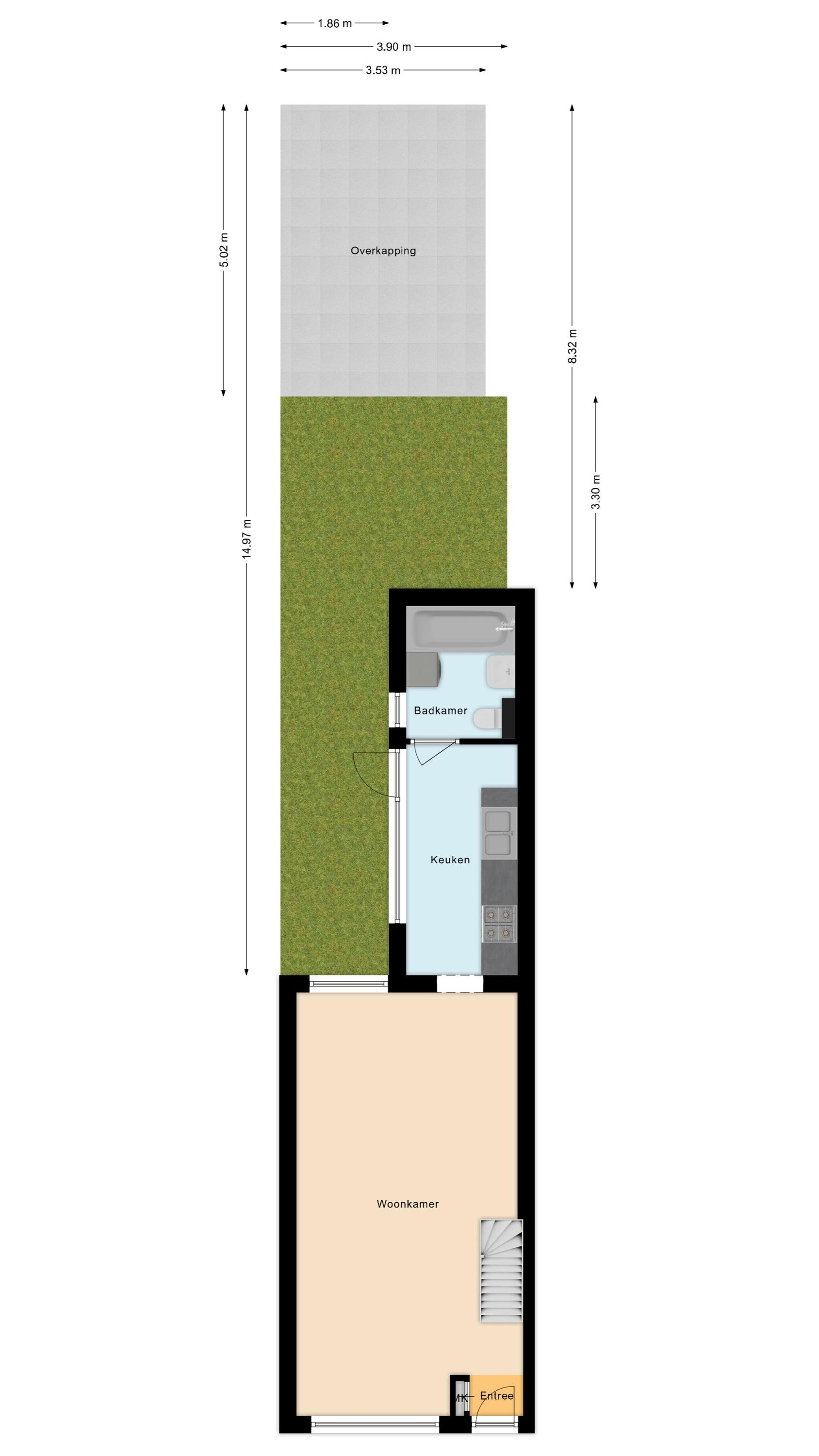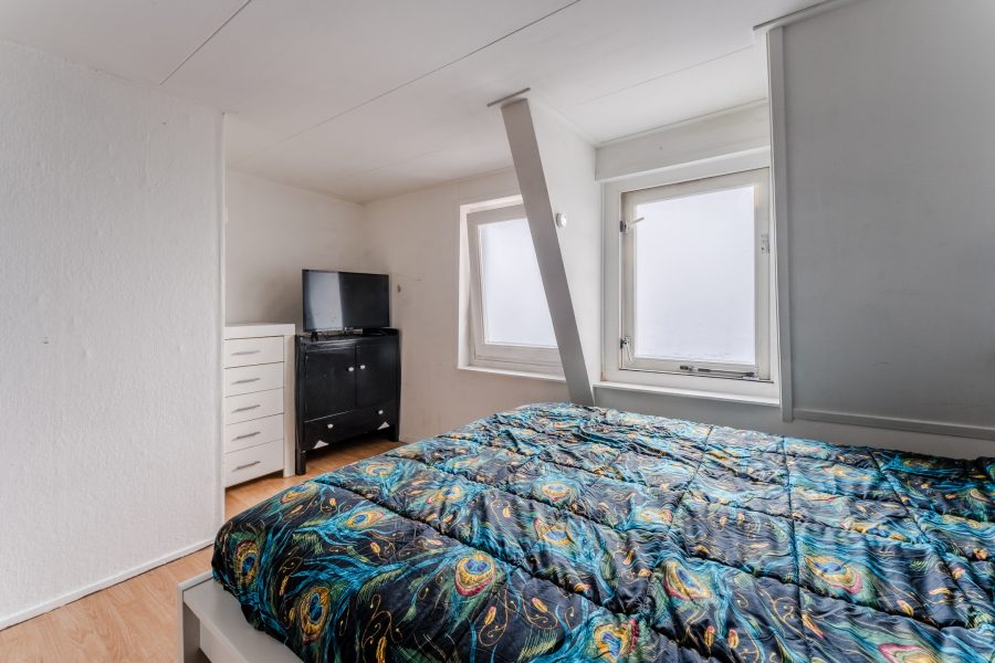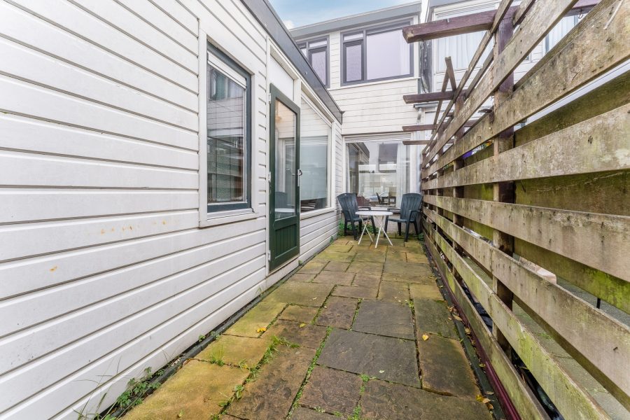 Inside you will find a living room with windows on both sides, a large kitchen, a nice bathroom and two spacious bedrooms. In addition, the house has a deep garden with privacy and a large canopy. Are you not afraid to roll up your sleeves? Then this is a great opportunity! Let’s show you around: