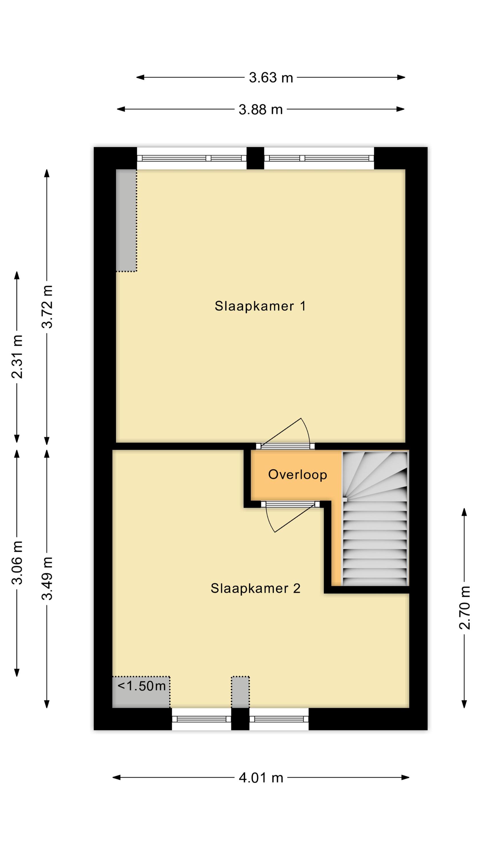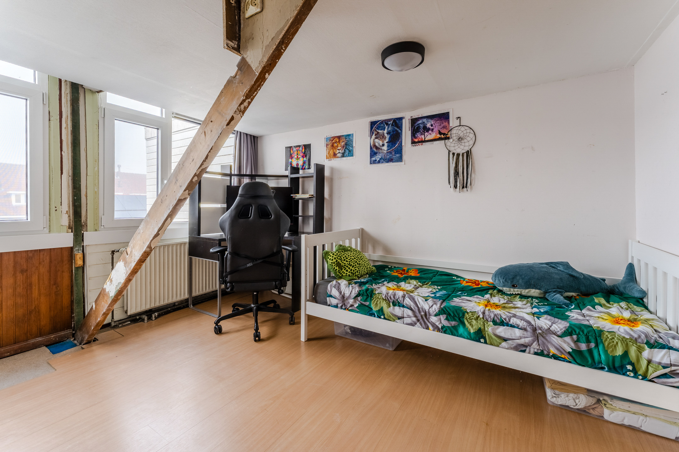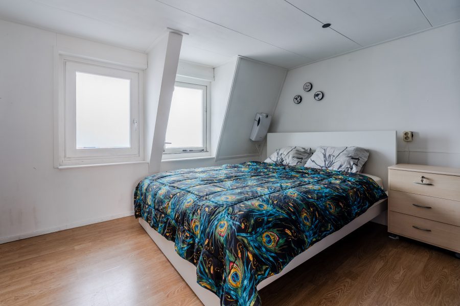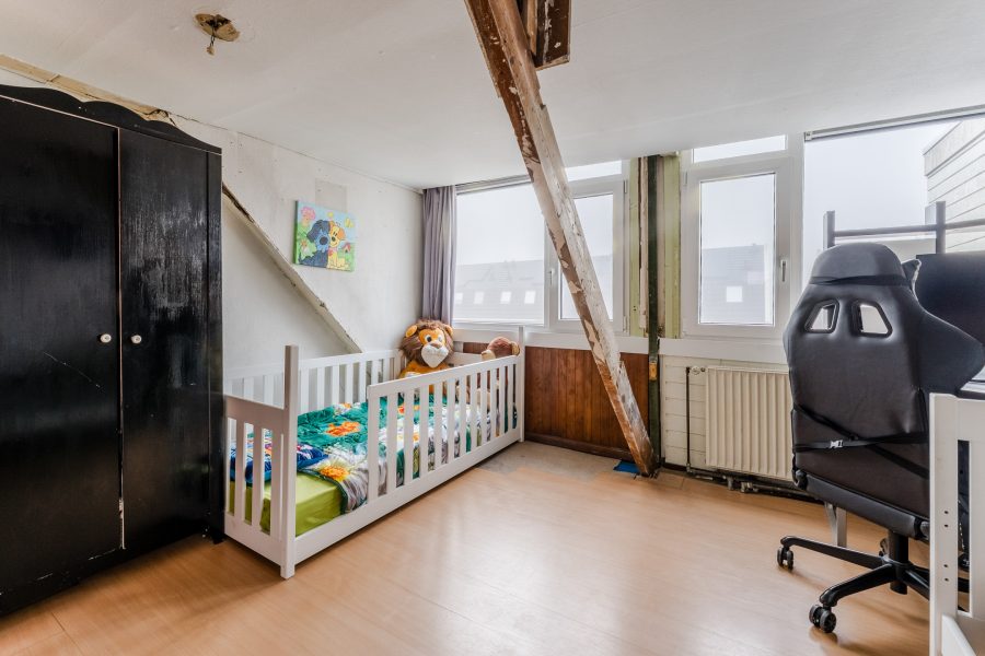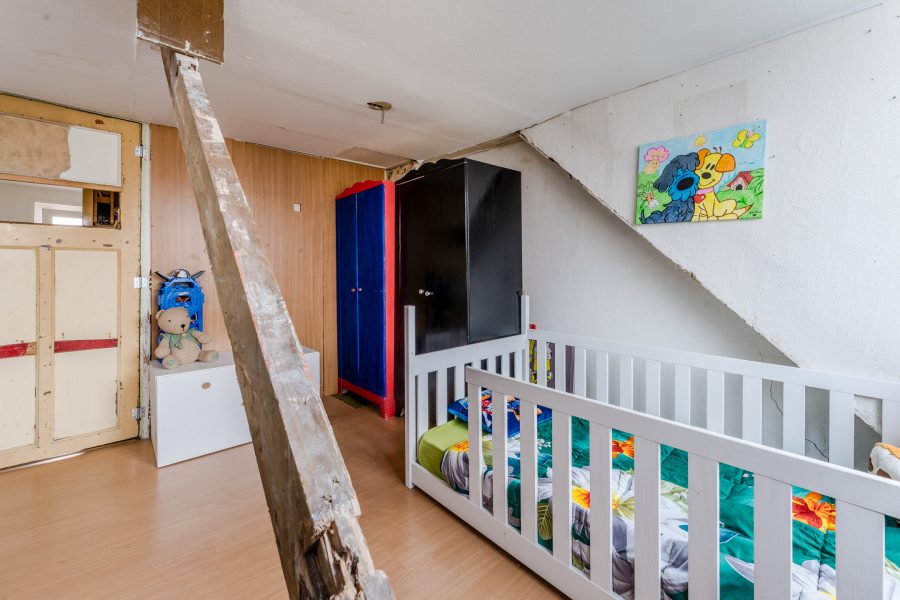 De trap in de woonkamer leidt naar de kleine overloop op deze verdieping. Vanaf hier heb je toegang tot de twee slaapkamers. Beide kamers zijn ruim van formaat en dienen te worden gemoderniseerd. Ze beschikken over een uitstekende lichtinval.