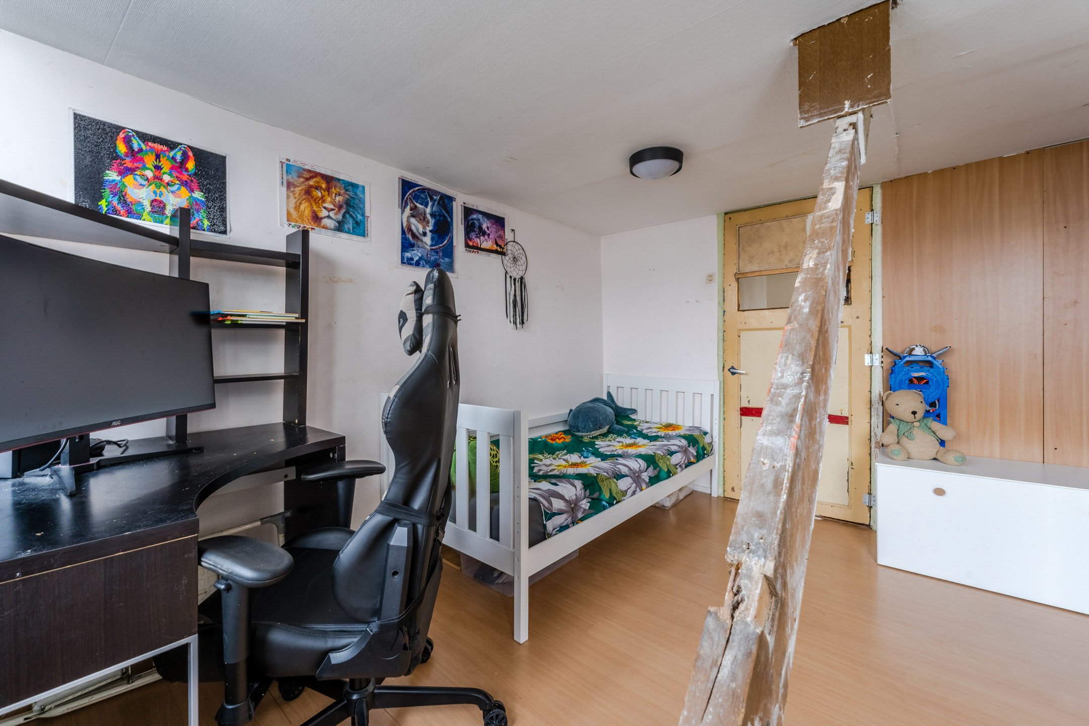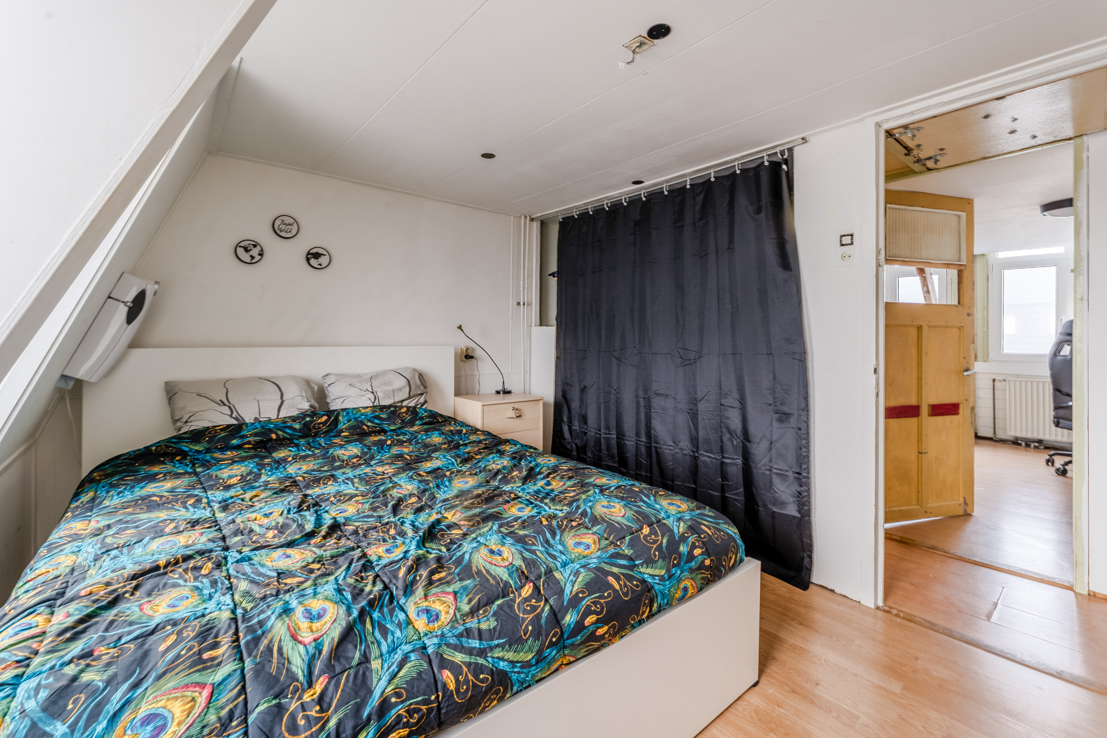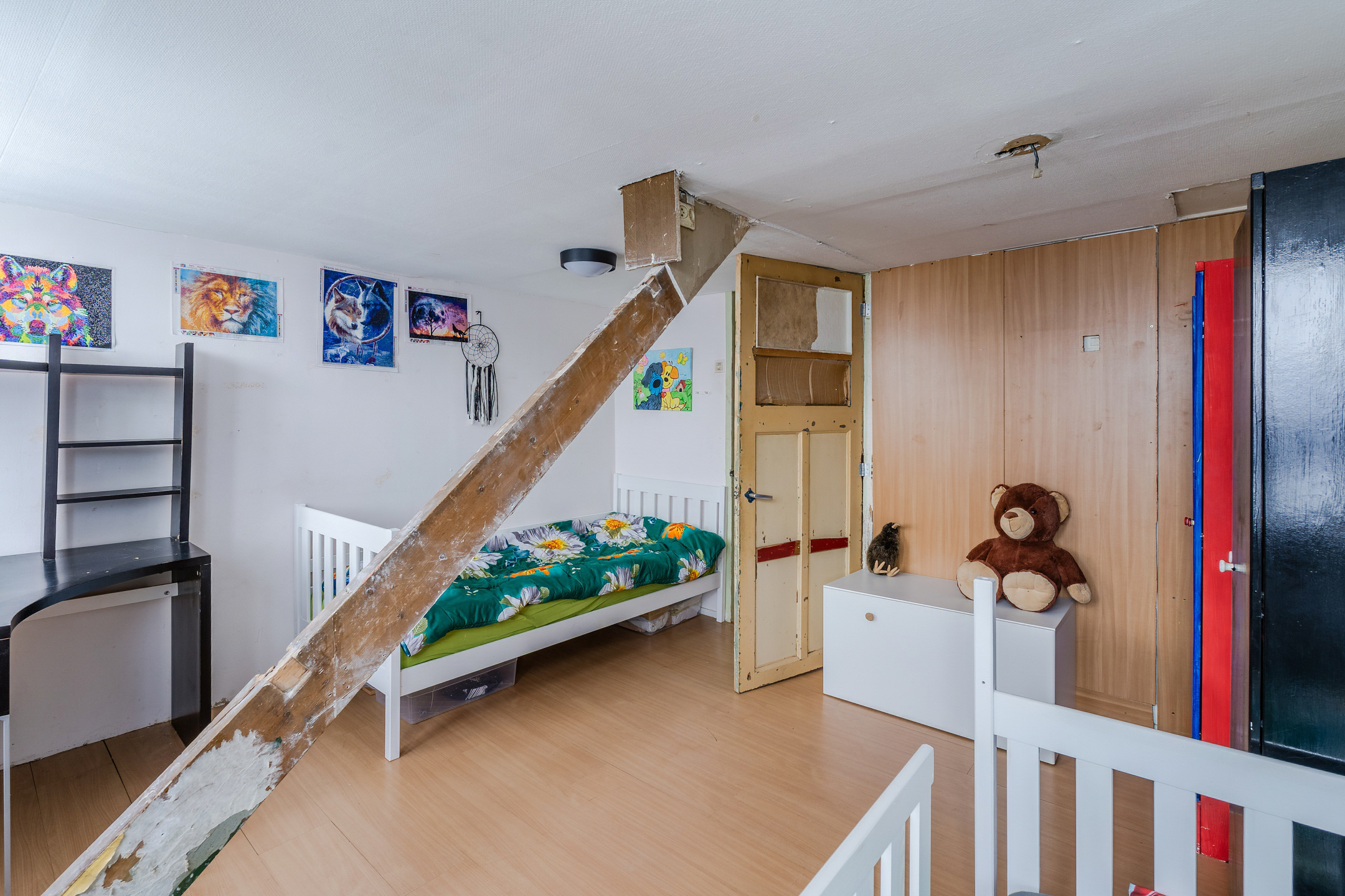 De trap in de woonkamer leidt naar de kleine overloop op deze verdieping. Vanaf hier heb je toegang tot de twee slaapkamers. Beide kamers zijn ruim van formaat en dienen te worden gemoderniseerd. Ze beschikken over een uitstekende lichtinval.