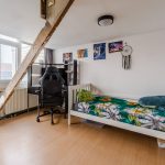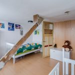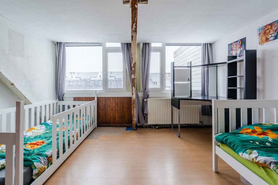 The stairs in the living room lead to the small landing on this floor. From here you have access to the two bedrooms. Both rooms are spacious and need to be modernized. They have excellent natural light.