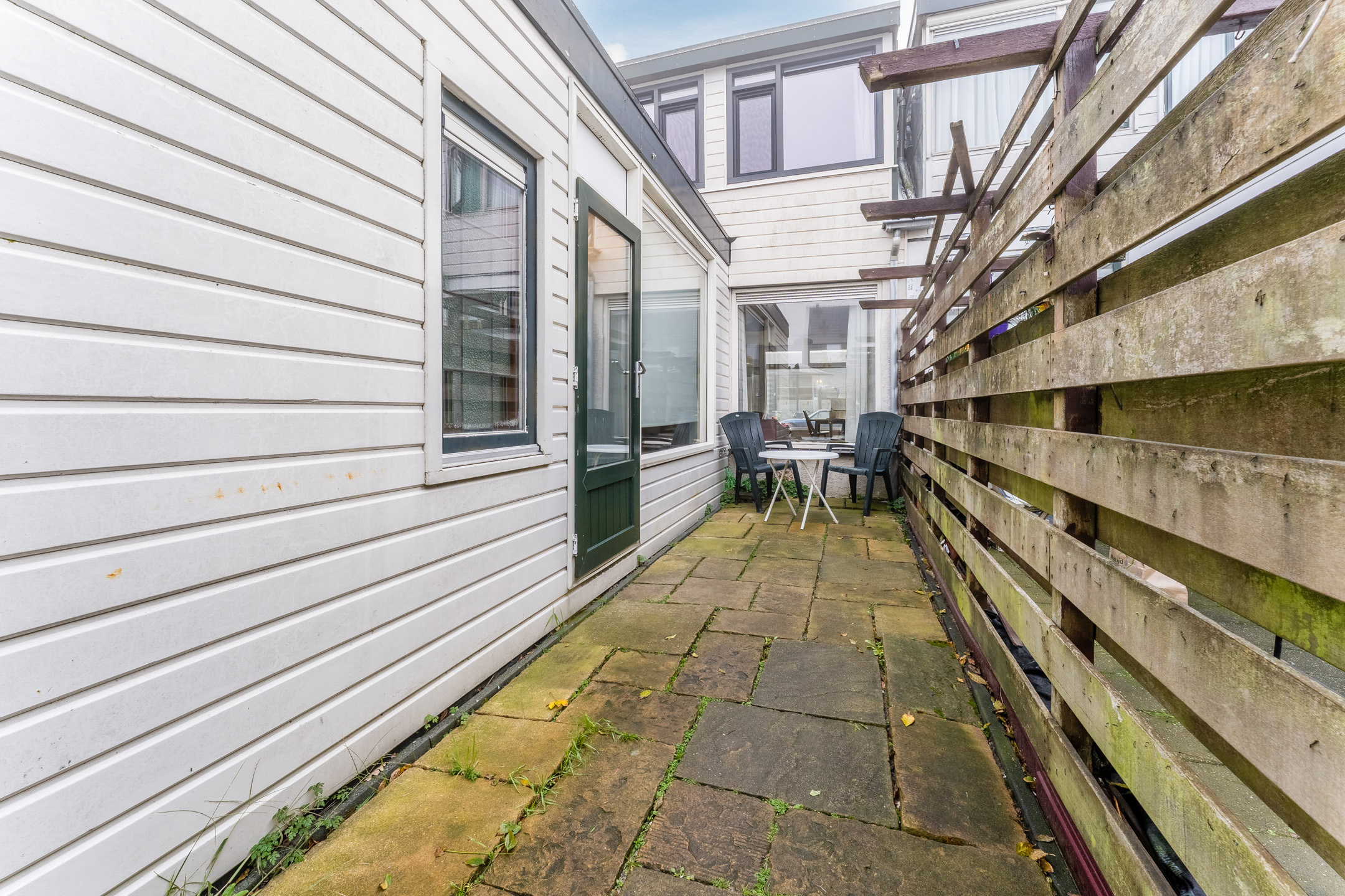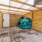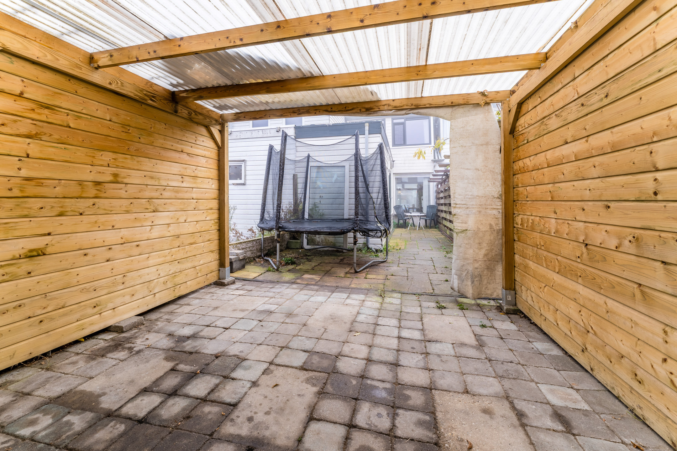 At the back of the garden is a spacious wooden canopy. Here you have the option of creating a covered lounge area. You also have space to store belongings or park bicycles here. There is a back entrance.