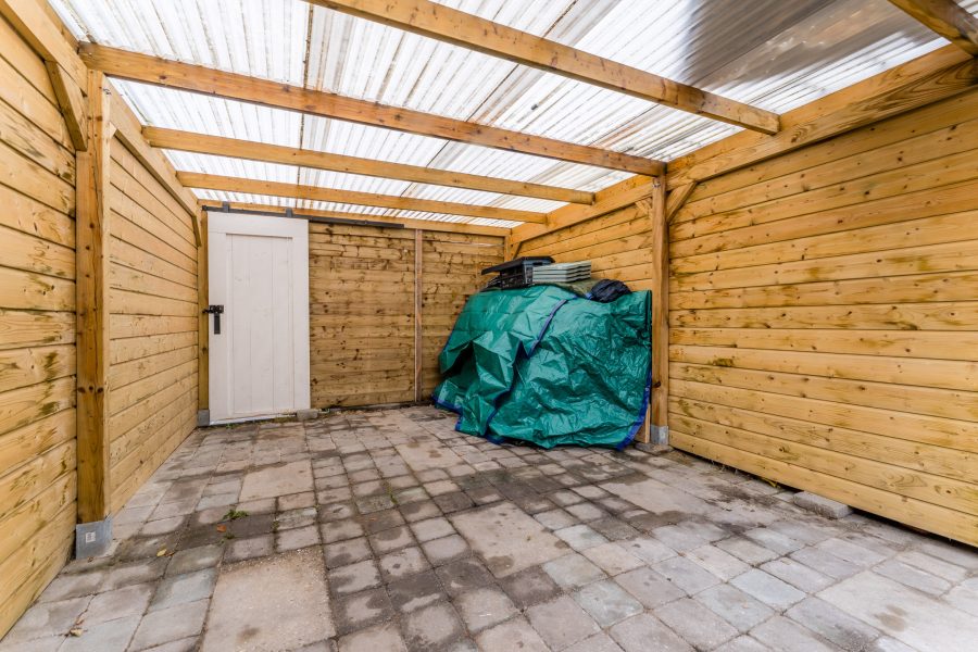 Achterin de tuin staat een royale houten overkapping. Hier heb je de mogelijkheid om een overdekte loungeplek in te richten. Daarnaast is er ruimte om spullen op te bergen of fietsen te stallen. Er is een achterom.