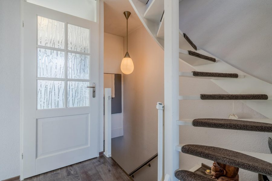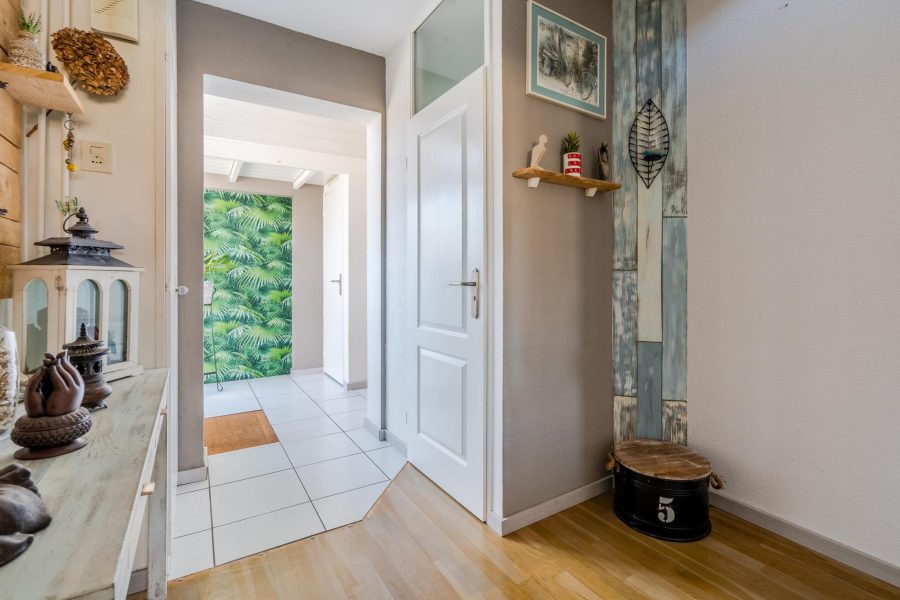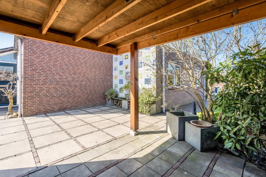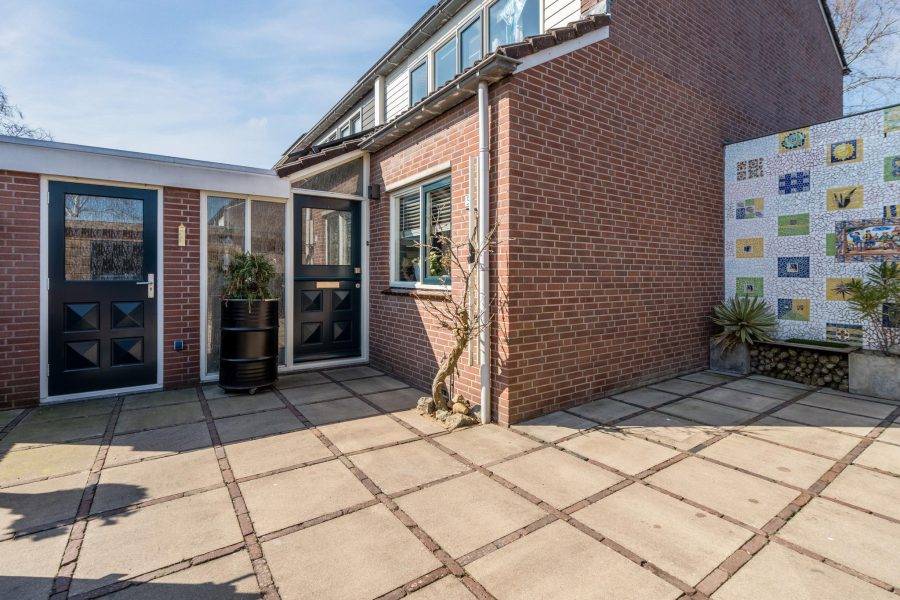 Via de brede stoep en het afgesloten hek bereiken we de voortuin van de woning. Je kunt via de voordeur of via de inpandige berging naar binnen gaan. Entree met garderobe en afgesloten kast met het witgoed. Open toegang tot een tweede hal met de meterkast, het staande toilet met fonteintje, de trapopgang naar de eerste verdieping. Via openslaande deuren heb je toegang tot de woonkamer. De lichte woonkamer is tuingericht, heeft aan de achterzijde een raampartij en een toegangsdeur tot de overkapping. Aan de voorzijde kun je eventueel naar wens een thuiswerkplek maken. Via een toog bereik je de U-vormige keuken met veel kastruimte, een eetbar en diverse inbouwapparatuur. Je kookt hier elektrisch. In deze ruimte is eveneens plaats voor een ruime eettafel. Openslaande deuren geven toegang tot de tuin. Op de vloer van de woonkamer ligt een eiken houten vloer en de muren en plafonds zijn strak afgewerkt. In de woonkamer bevindt zich een trapkast.