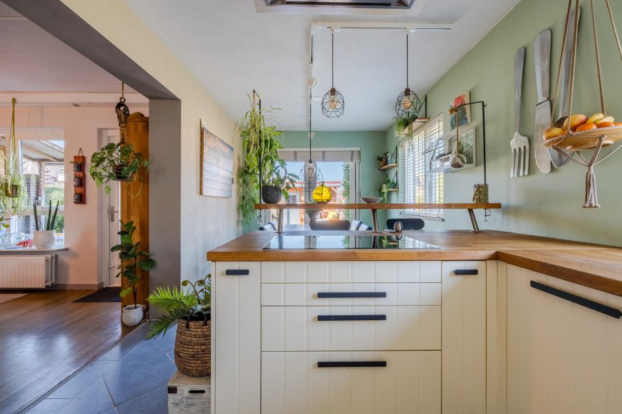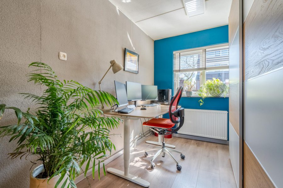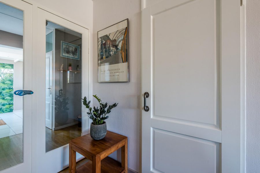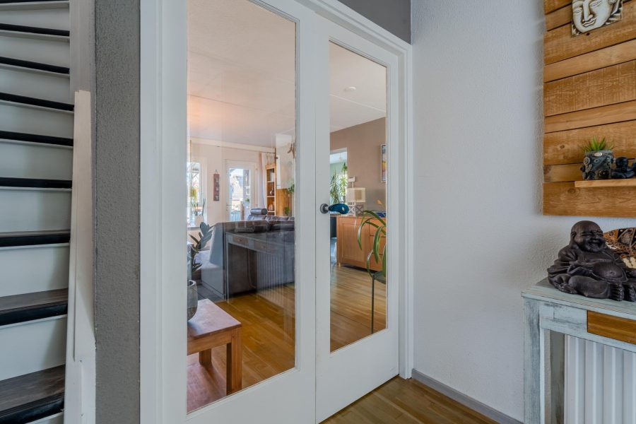 Through the wide pavement and the locked gate, you reach the front garden of the house. You can enter through the front door or through the indoor storage room. Entrance with cloakroom and enclosed closet with the washer and dryer. Open access to a second hallway with the meter closet, standing toilet with hand basin, staircase to the first floor. Through French doors you have access to the living room. The bright living room is oriented towards the garden, has a window at the back and an entrance door to the canopy. At the front, you could possibly create a home office as desired. Via an arch, you reach the U-shaped kitchen with lots of cupboard space, a breakfast bar and various appliances. You cook electric here. This room also has room for a large dining table. French doors give access to the garden. The living room has an oak wooden floor and the walls and ceilings are finished to a high standard. There is a stairs closet in the living room.