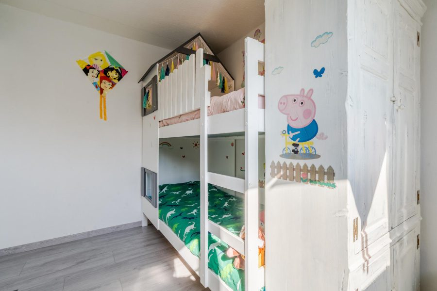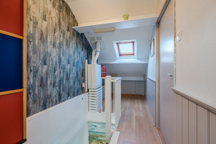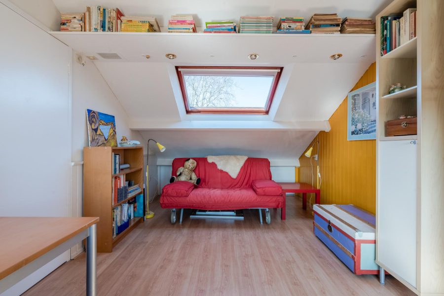 Via the open staircase we reach the landing. Here you will find the central heating system, the third spacious and bright bedroom and lots of storage space. This floor is also perfectly finished. Daylight enters via windows and Velux skylights.