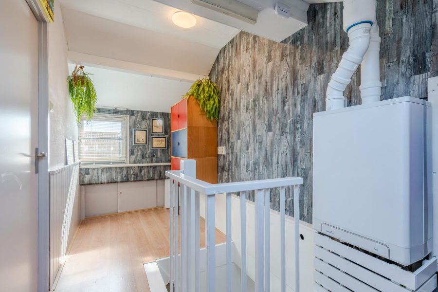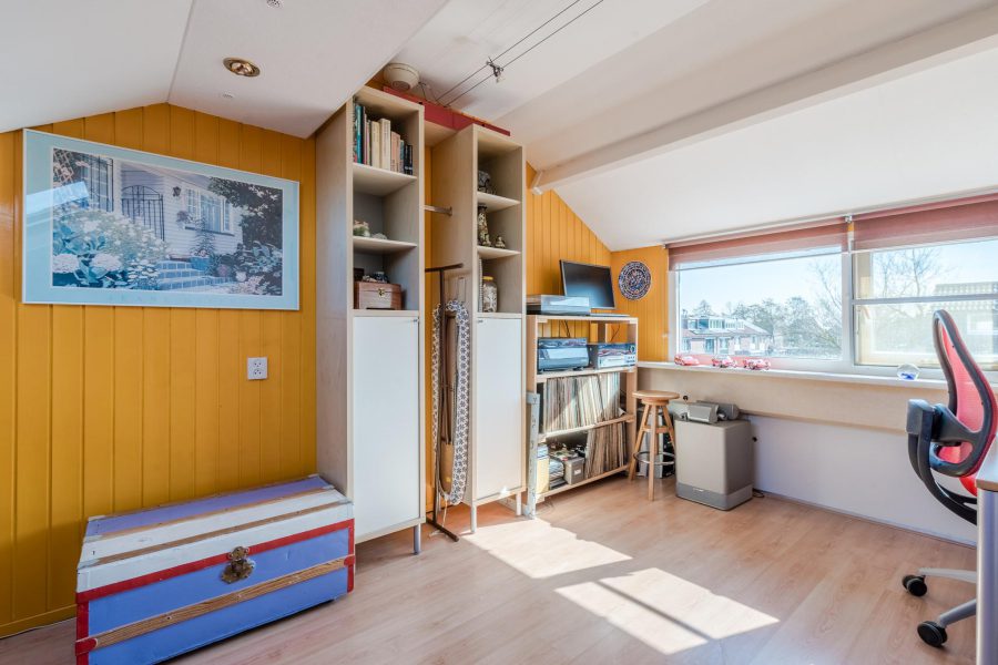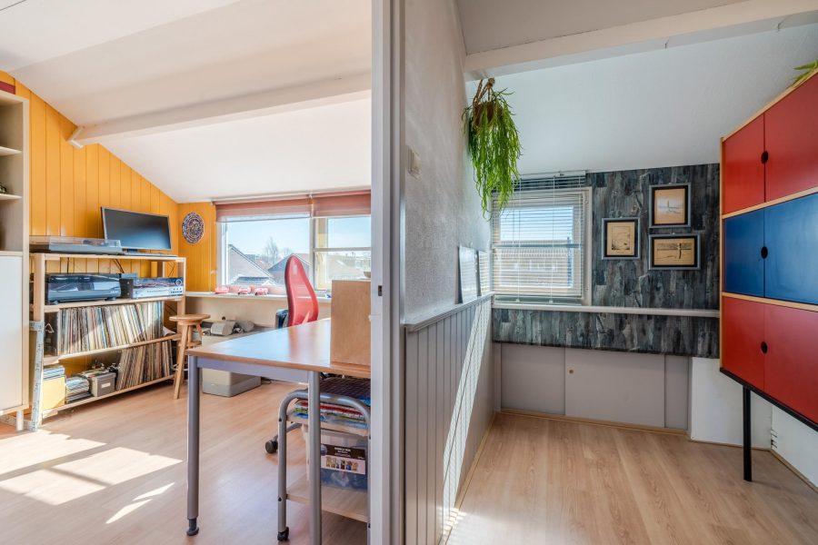 Via de open trap bereiken we de overloop. Hier tref je de cv-installatie aan, de derde ruime en lichte slaapkamer en nog veel bergruimte. Ook deze verdieping is perfect afgewerkt. Daglicht komt via raampartijen en Velux dakramen naar binnen.