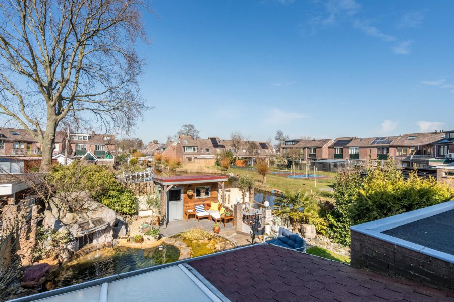 De woning heeft een fraai aangelegde tuin met een grote zwemvijver, twee tuinhuizen met overkapping en een terras aan het water. De tuin biedt de mogelijkheid voor verschillende loungeplekken. Er is altijd een plekje in de zon of schaduw te vinden. Aan het terras aan het water kun je een bootje aanleggen en zo het open water opvaren en in de winter stap je bij vorst zo het ijs op.
