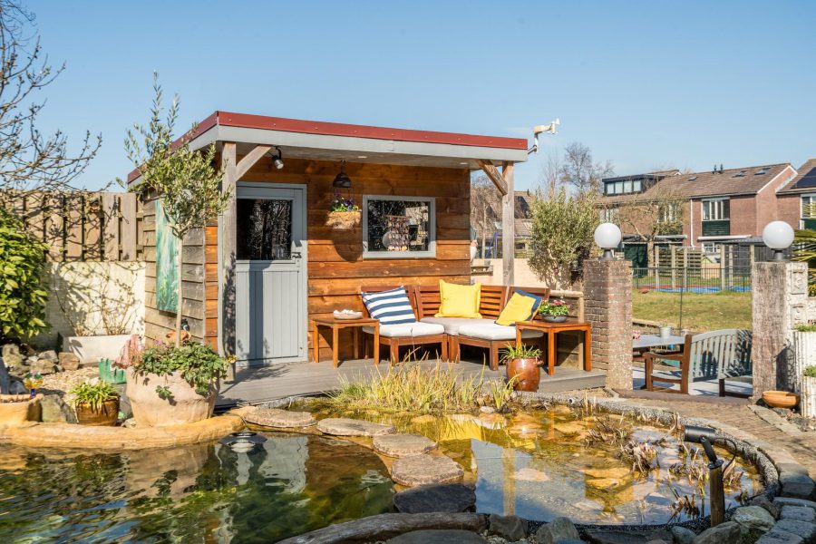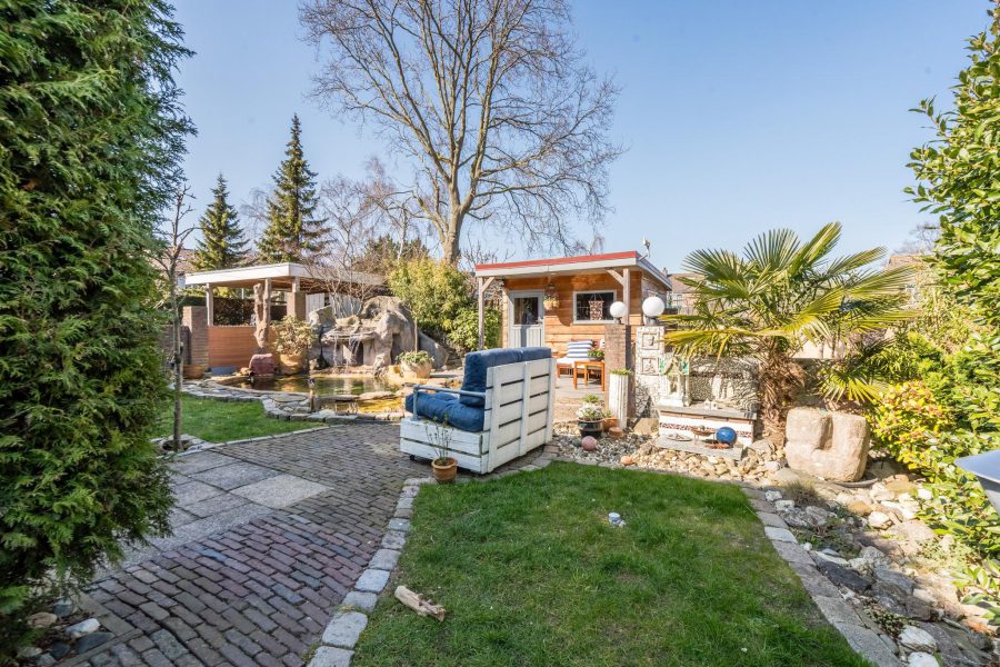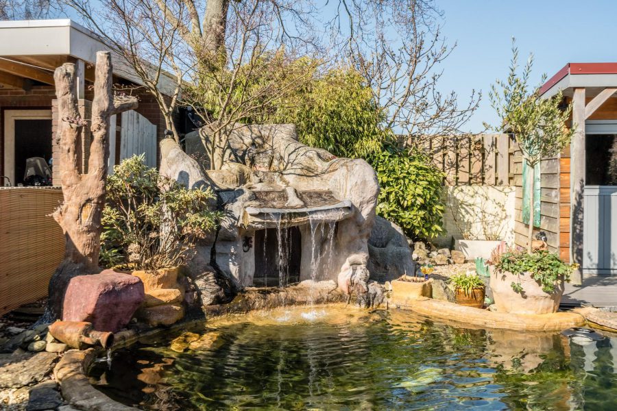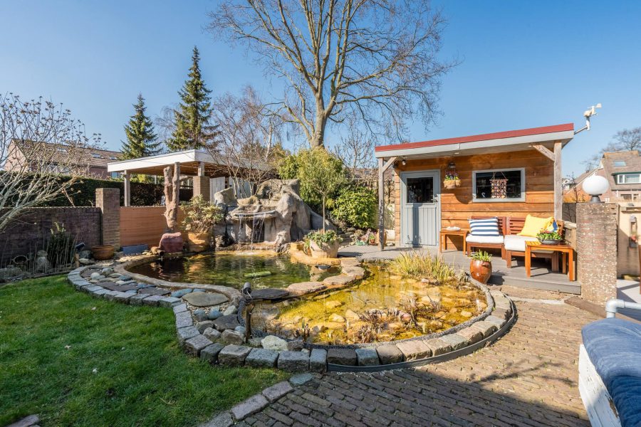 • Zeer ruime tuin (voor-, zij- en achtertuin) met twee tuinhuizen, grote vijver en terras aan het water