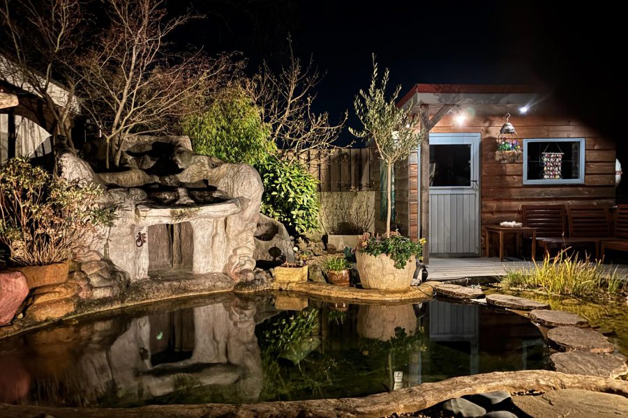 • Very spacious garden (front, side and back) with two garden sheds, large pond and terrace on the water