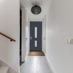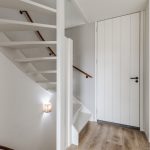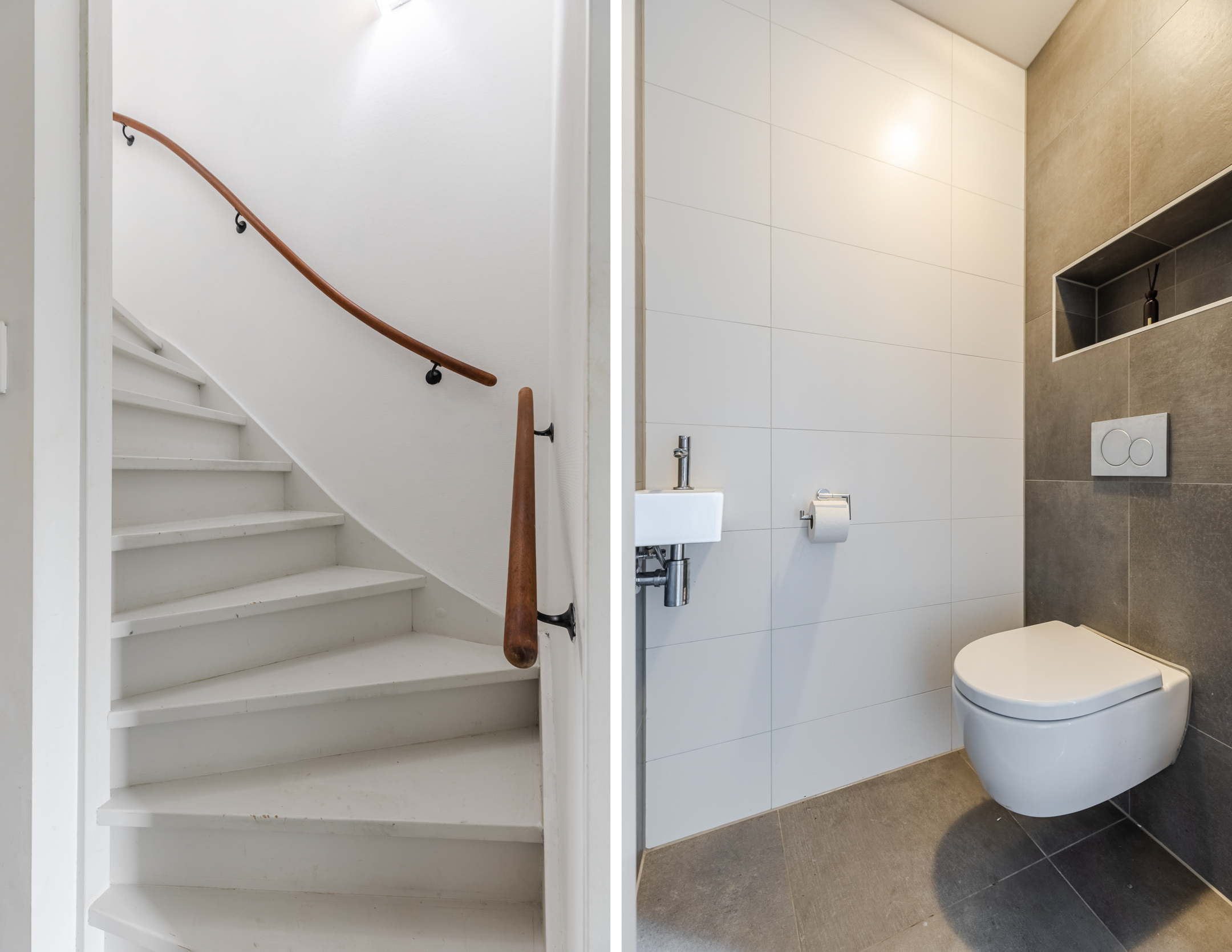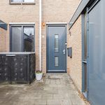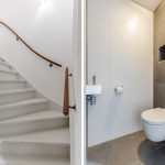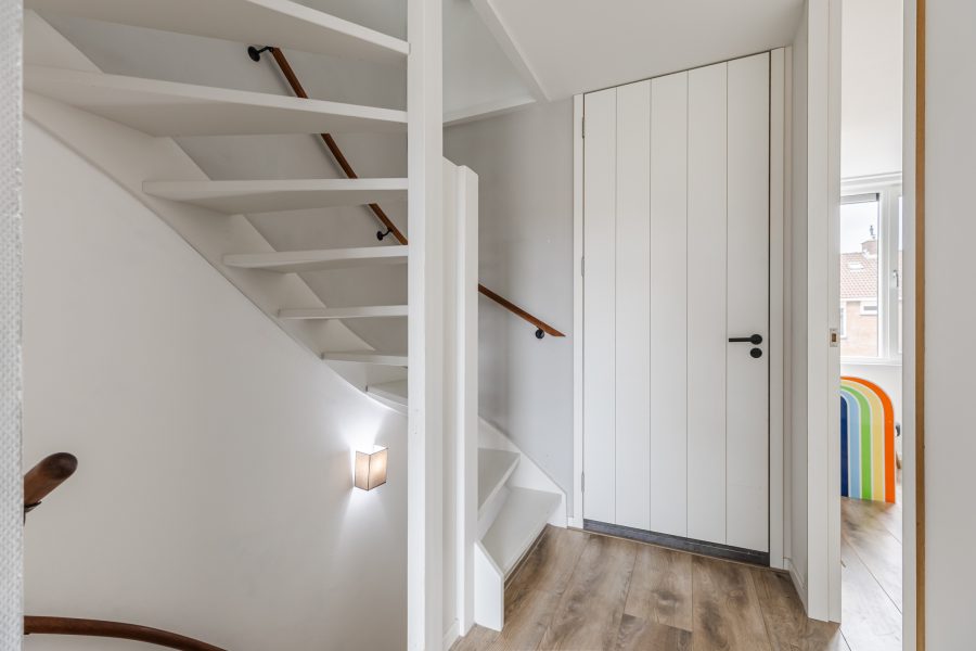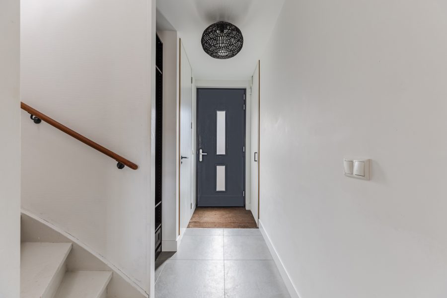 Through the tiled front yard, you reach the (bike) storage shed and the front door of the house. Behind the front door is a spacious and neatly finished entrance hall. From here, there is access to the meter cupboard, a toilet room with a floating toilet and sink, the staircase to the first floor, a storage closet and the living room.