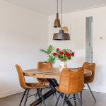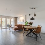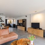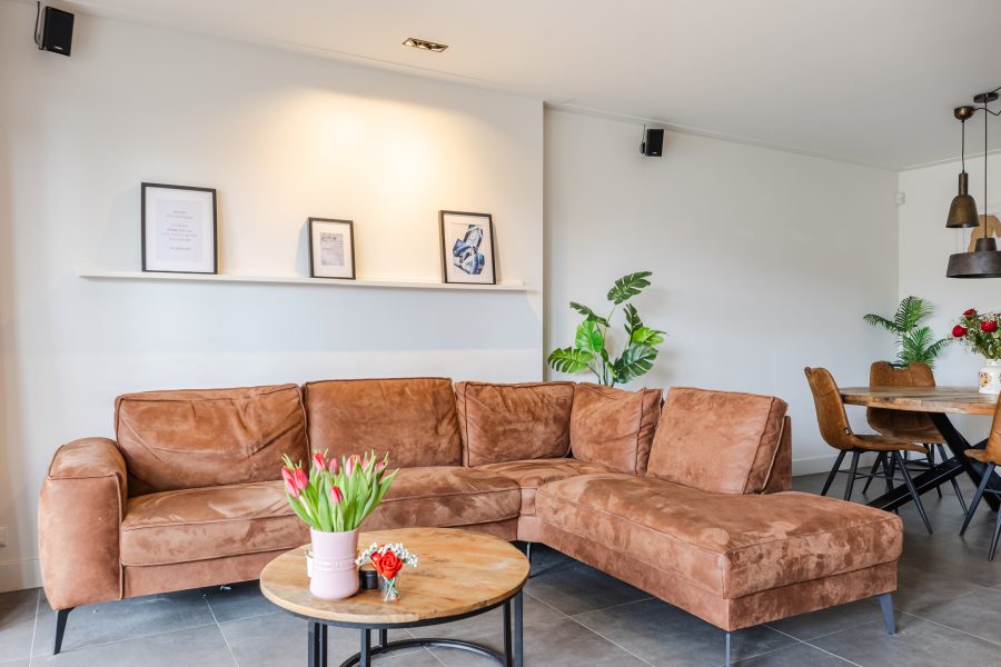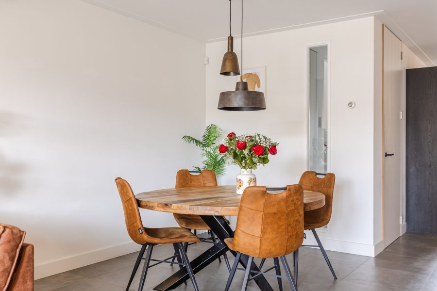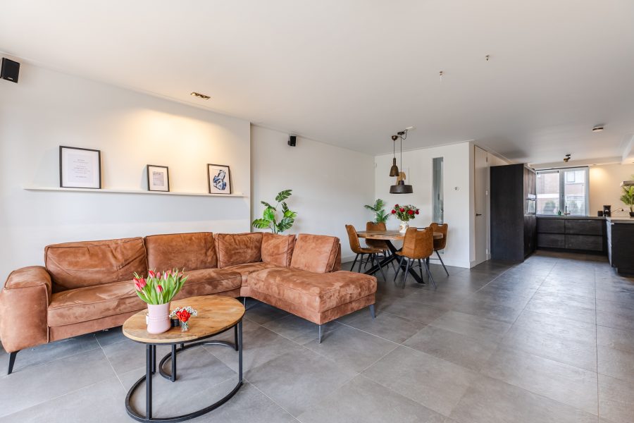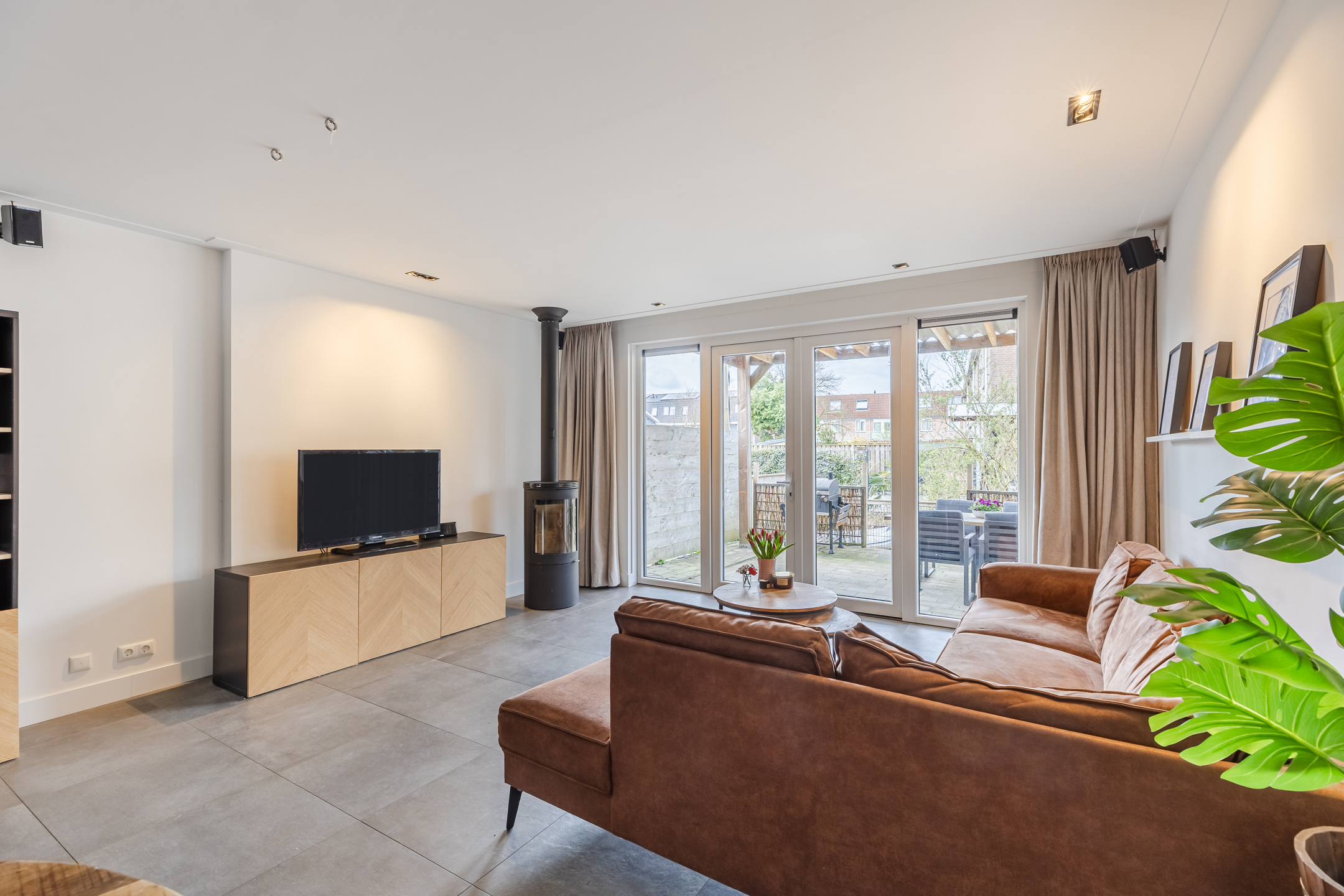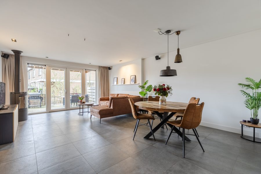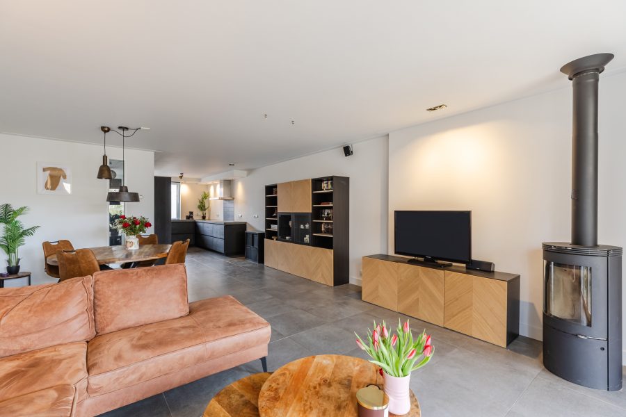 The entrance hall and living room feature dark gray tile flooring with underfloor heating. The living room has been extended, making it very spacious. The large window at the front and the garden doors at the back provide pleasant natural light. The living room is further illuminated by sleek recessed spotlights. At the back of the living room is a wood-burning stove.