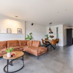 De hal en woonkamer zijn voorzien van een donkergrijze tegelvloer met vloerverwarming. De woonkamer is uitgebouwd en daardoor zeer ruim. Het grote raam aan de voorzijde en de openslaande tuindeuren aan de achterzijde zorgen voor een aangename lichtinval. Verder wordt de woonkamer verlicht door strakke inbouwspots. Achterin de woonkamer bevindt zich een houtkachel.