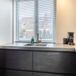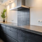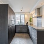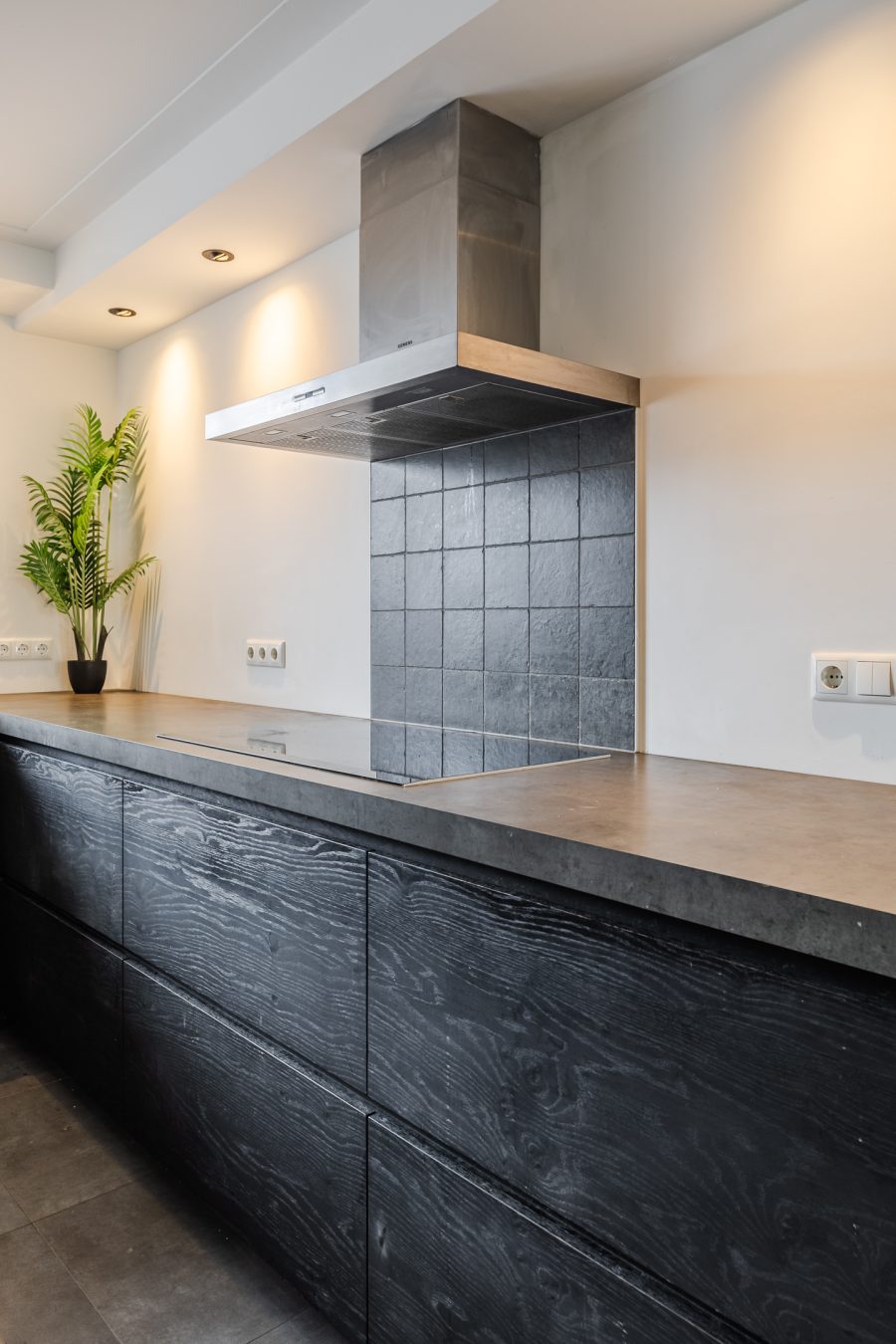 At the front of the house is the modern open kitchen (2017). It consists of a corner kitchen unit and a wall of cabinets. The entire kitchen is finished with black wood-look cabinet fronts and a gray countertop. The kitchen is equipped with high-quality appliances, including an induction stove, range hood, ovens, refrigerator and freezer. There is plenty of cabinet space available.