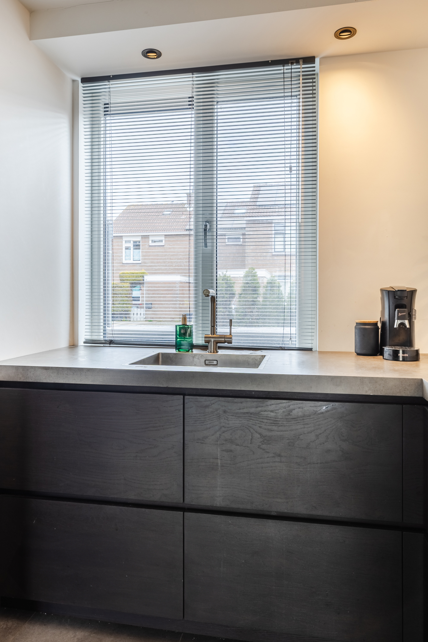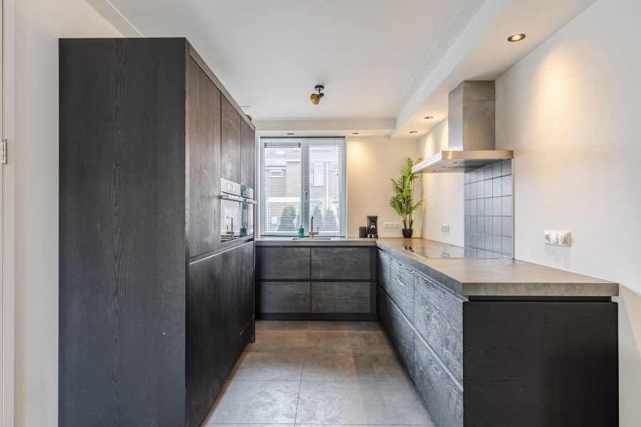 Aan de voorzijde van het huis staat de moderne open keuken (2017). Deze bestaat uit een keukenblok in hoekopstelling en een kastenwand. Het geheel is afgewerkt met zwarte houtlook fronten en een grijs werkblad. De keuken is uitgerust met hoogwaardige apparatuur, waaronder een inductie fornuis, afzuigkap, ovens, koelkast en vriezer. Er is volop kastruimte aanwezig.