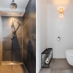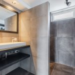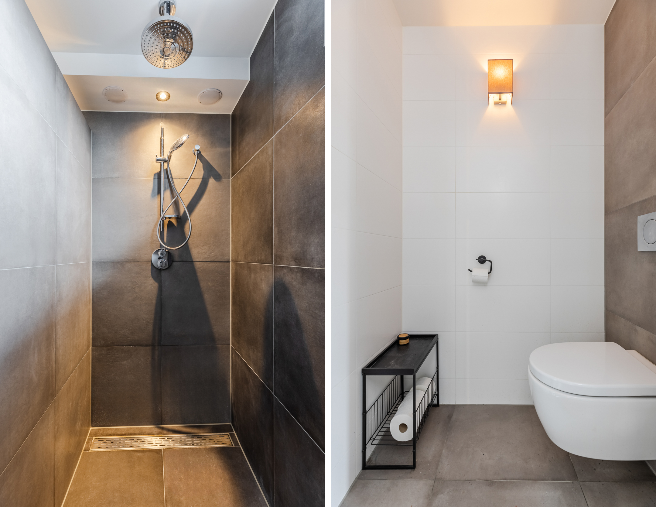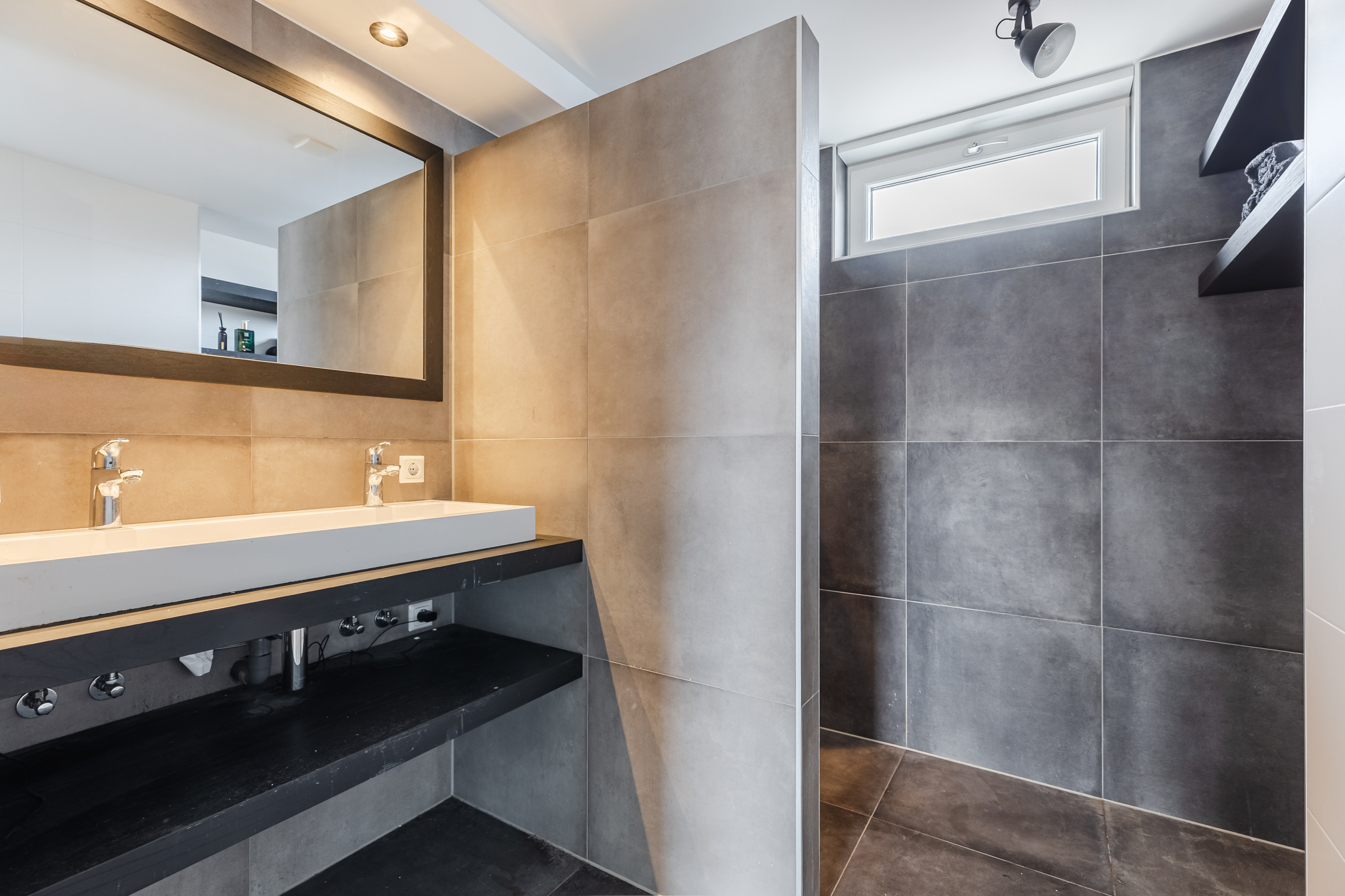 De luxe badkamer is negen jaar geleden vernieuwd en straalt volop luxe uit. Deze ruimte is afgewerkt met moderne grijze tegels en uitgerust met een badmeubel met wastafel en een inloopdouche met regendouche.