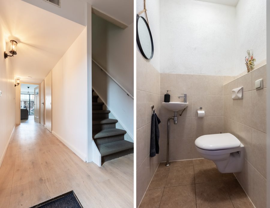 Entree met meterkast en garderobe, trapopgang naar de eerste verdieping, bergkast, zwevend toilet met fonteintje en toegang tot de woonkamer met open keuken. De lichte, tuingerichte woonkamer heeft aan de achterzijde een brede, hoge raampartij met openslaande deur naar de tuin. Hier is plaats voor een ruime zithoek. Aan de voorzijde is de keuken met kookeiland met eetbar voor 2 personen gesitueerd. Verschillende apparatuur is vernieuwd o.a. de vaatwasser in 2021 en het gasfornuis in 2019. Ook de keuken heeft een fijne lichtinval. In de buurt van de keuken is plaats voor een eettafel. Er ligt een mooie houten vloer en de muren en plafonds zijn strak afgewerkt.