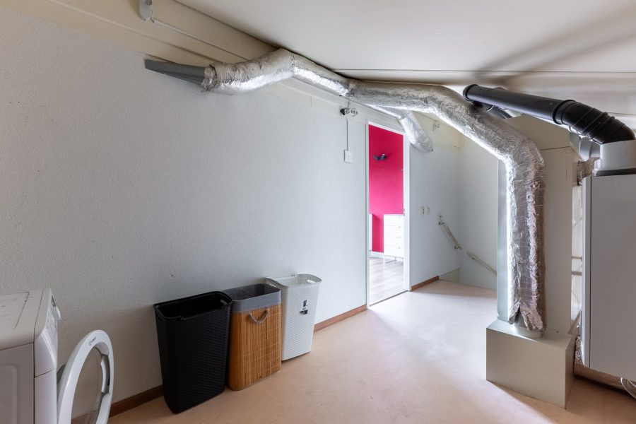 We reach this floor via the open staircase. Here you will find bedroom/study number 4. A nice, well-finished, bright room with a wide window. The landing houses the technical installation and connection for washer and dryer.