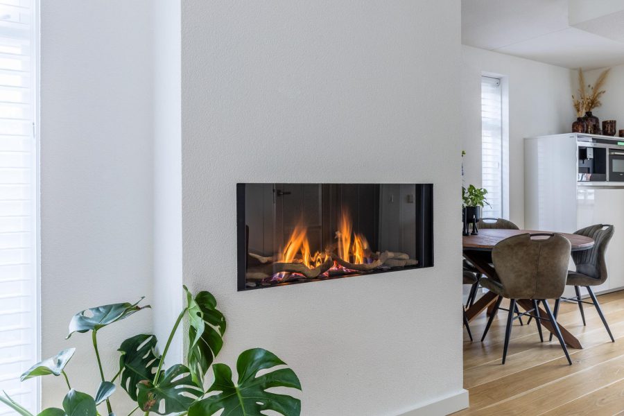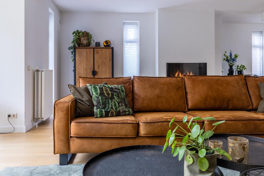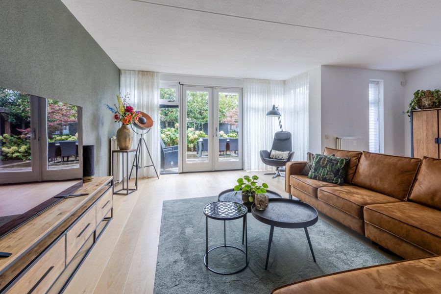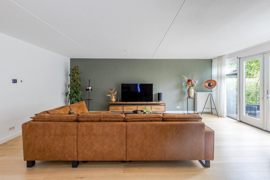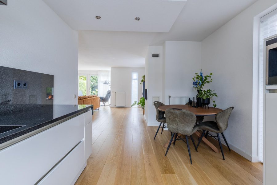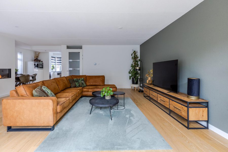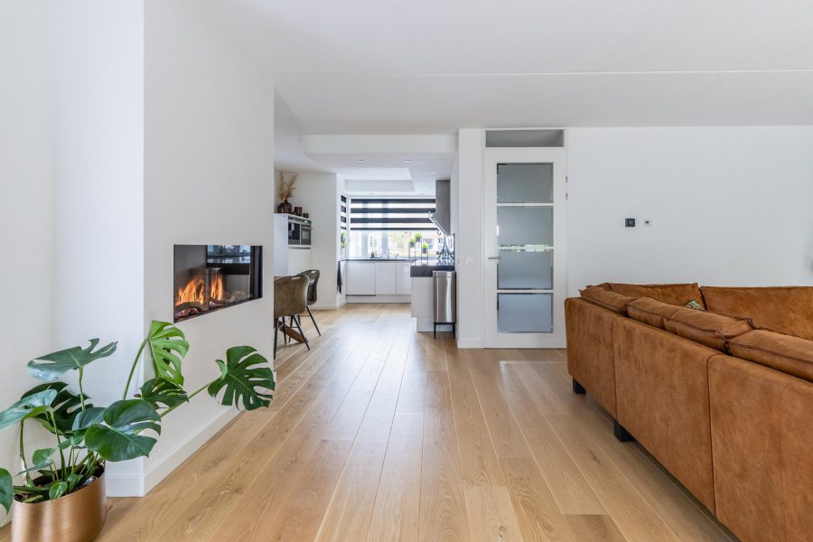 De ruim opgezette woonkamer bevindt zich aan de achterzijde van het huis en is voorzien van een prachtige vloer. De wanden en het plafond zijn hier strak afgewerkt in rustige tinten. Er zijn meerdere raampartijen aanwezig, waardoor je van veel daglicht geniet. De grote raampartij aan de achterzijde heeft openslaande deuren naar de tuin. De woonruimte is uitgerust met een prachtige gashaard.