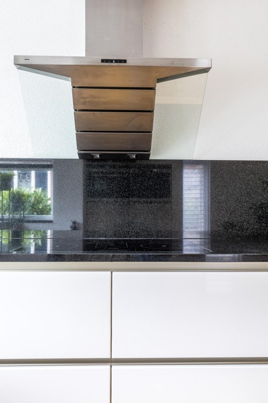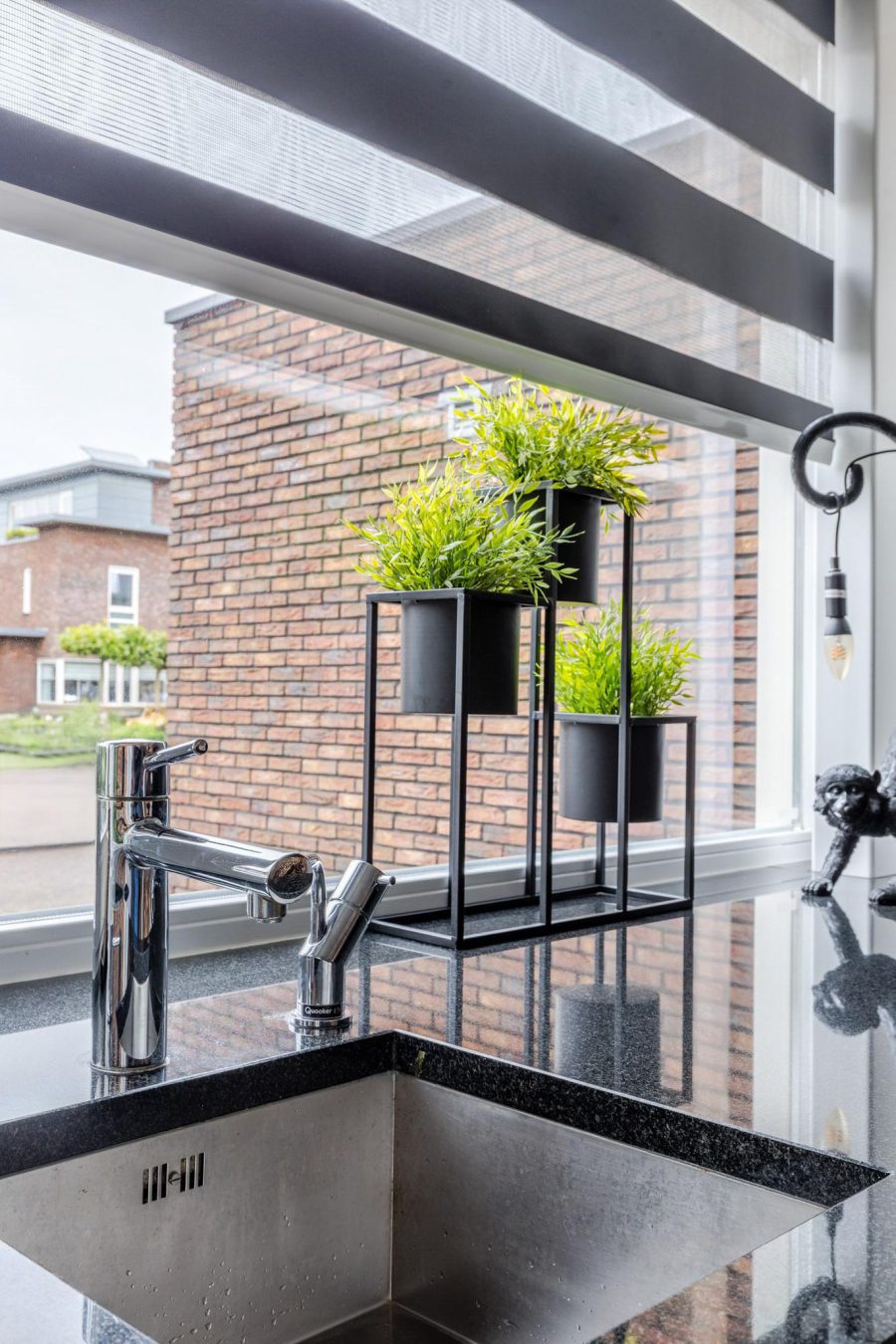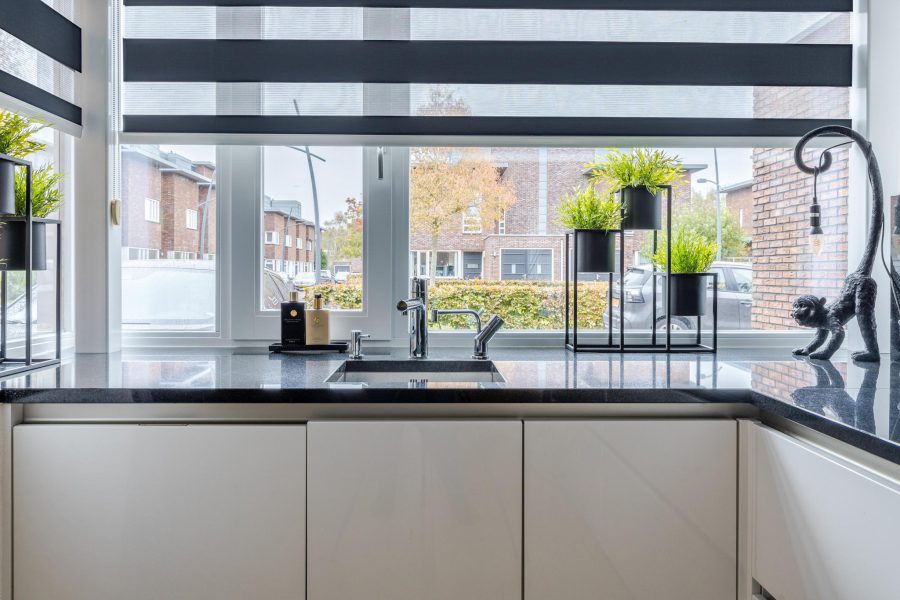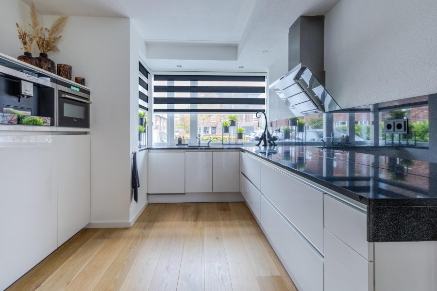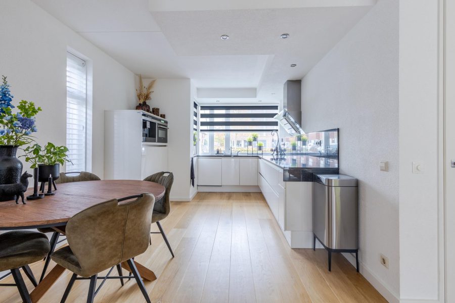 De fraaie open keuken (2009) is aan de voorzijde van het huis te vinden. Deze moderne keuken kenmerkt zich door de witte keukenkastjes en het donkere werkblad en is van alle gemakken voorzien. Je treft hier een vaatwasser, inductie fornuis, afzuigkap, oven, koelkast en Quooker aan. De keuken wordt verlicht met inbouwspots.