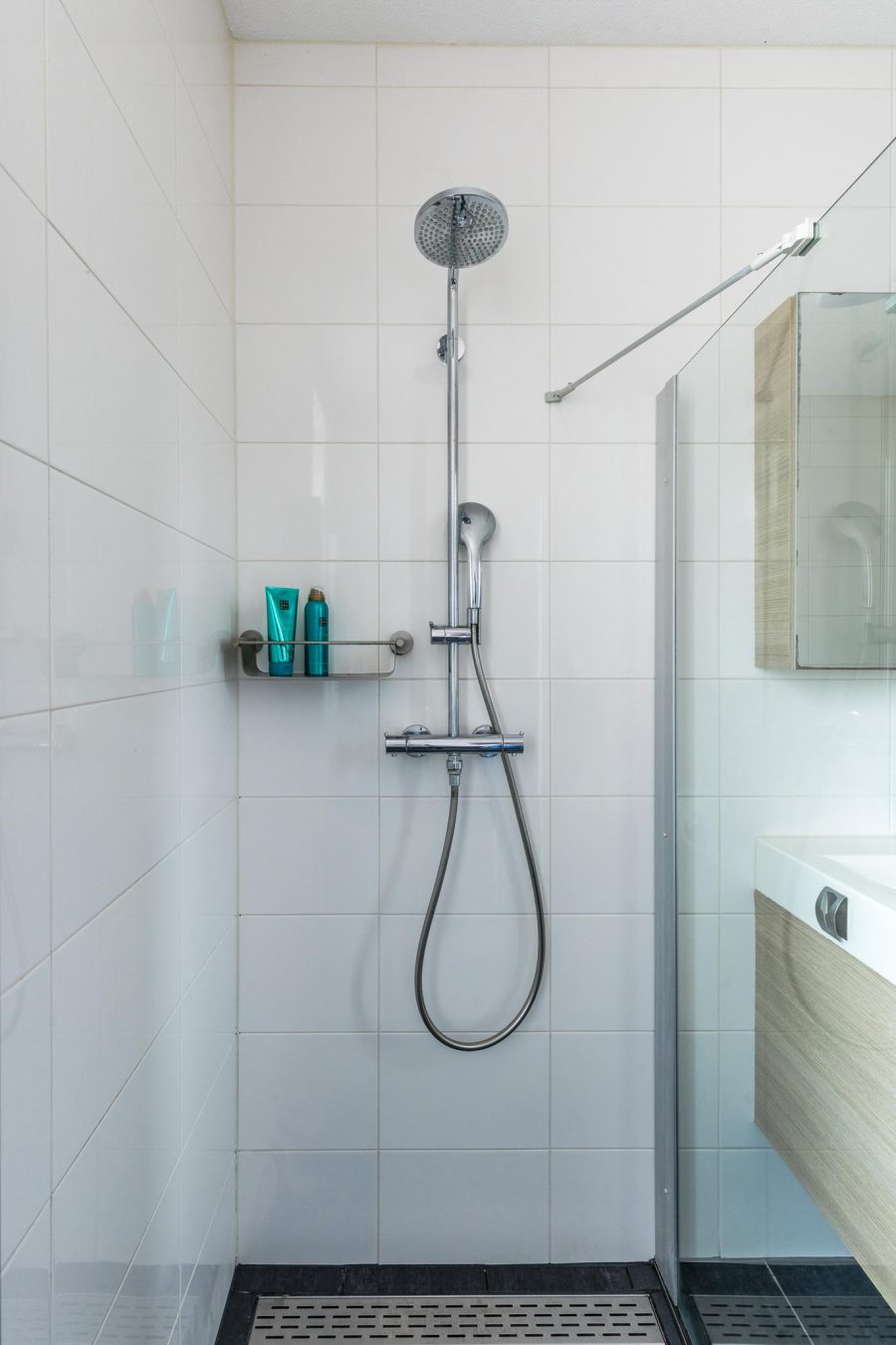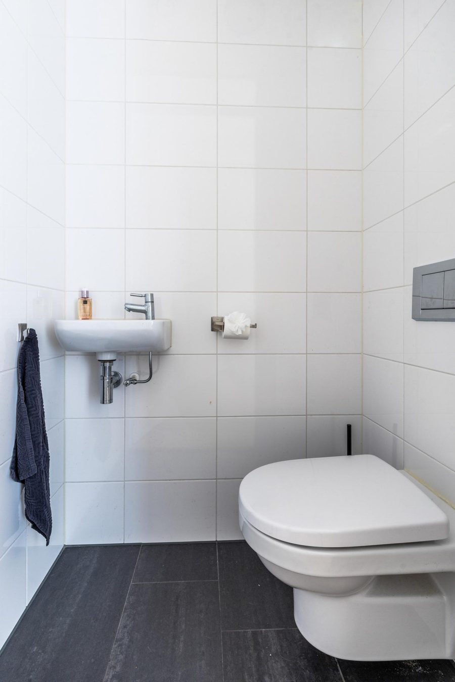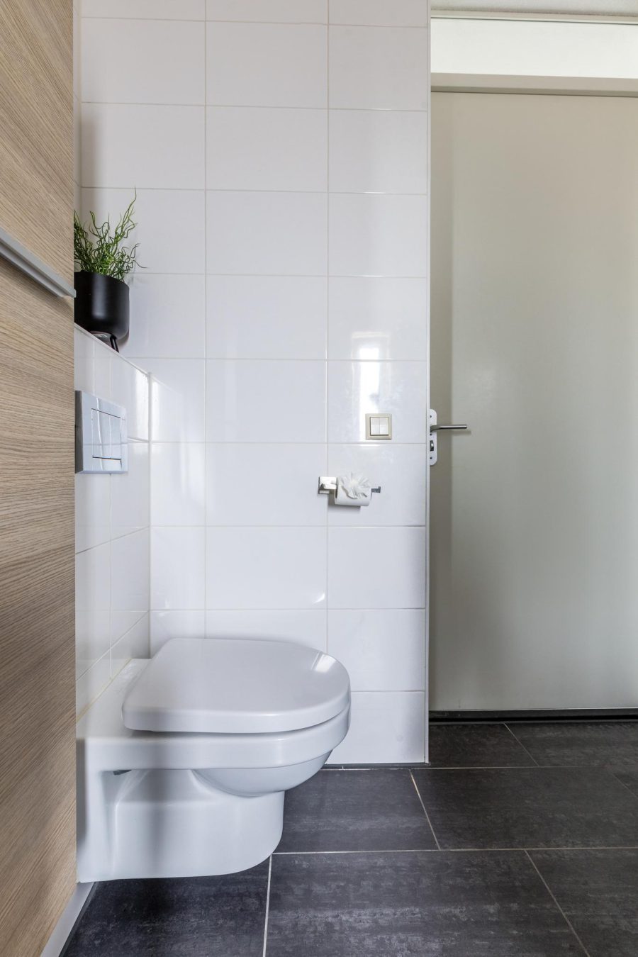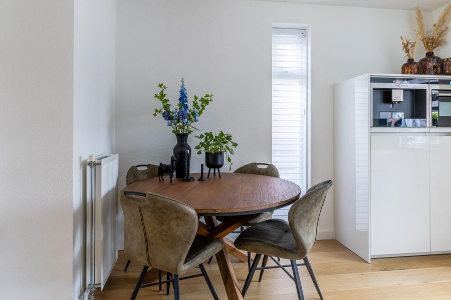 The beautiful open kitchen (2009) can be found at the front of the house. This modern kitchen is characterized by the white kitchen cabinets and dark countertop and is fully equipped. You will find a dishwasher, induction stove, extractor hood, oven, refrigerator and Quooker here. The kitchen is illuminated with recessed spotlights.