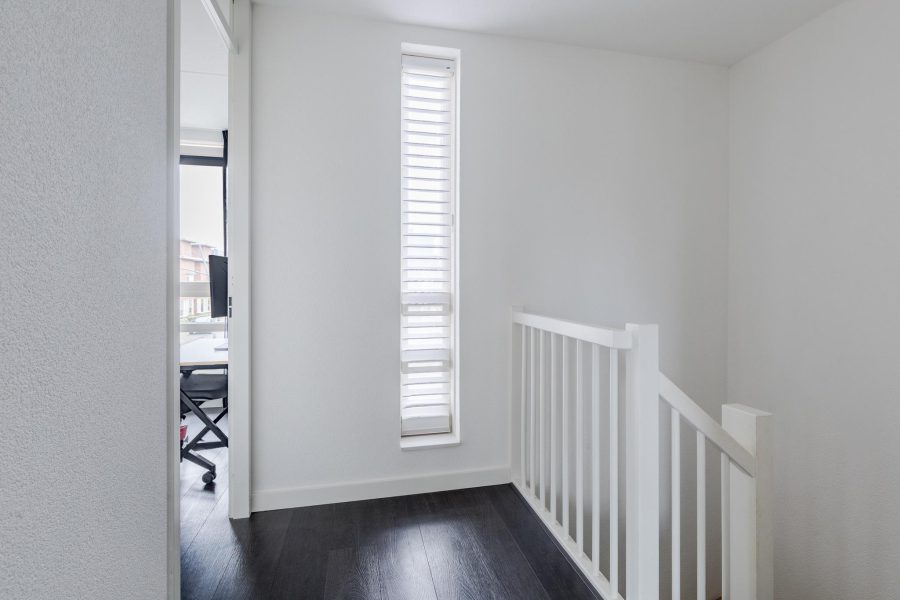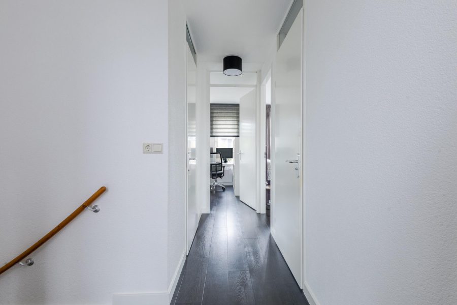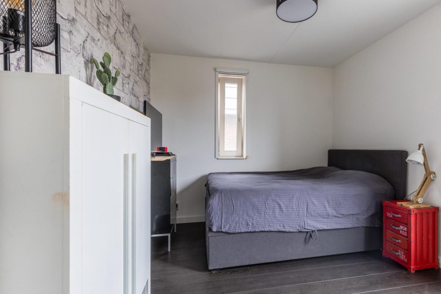 De trap in de entreehal biedt toegang tot de overloop van de eerste verdieping. Via deze overloop bereik je de berging, drie slaapkamers en badkamer. Van de drie ruime slaapkamers zijn er twee aan de achterzijde gelegen en één aan de voorzijde. Alle kamers beschikken over een donkere vloer en keurig afgewerkte muren en plafonds. In elke slaapkamer is de lichtinval uitstekend.