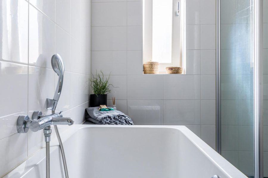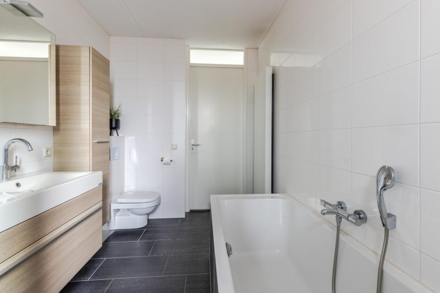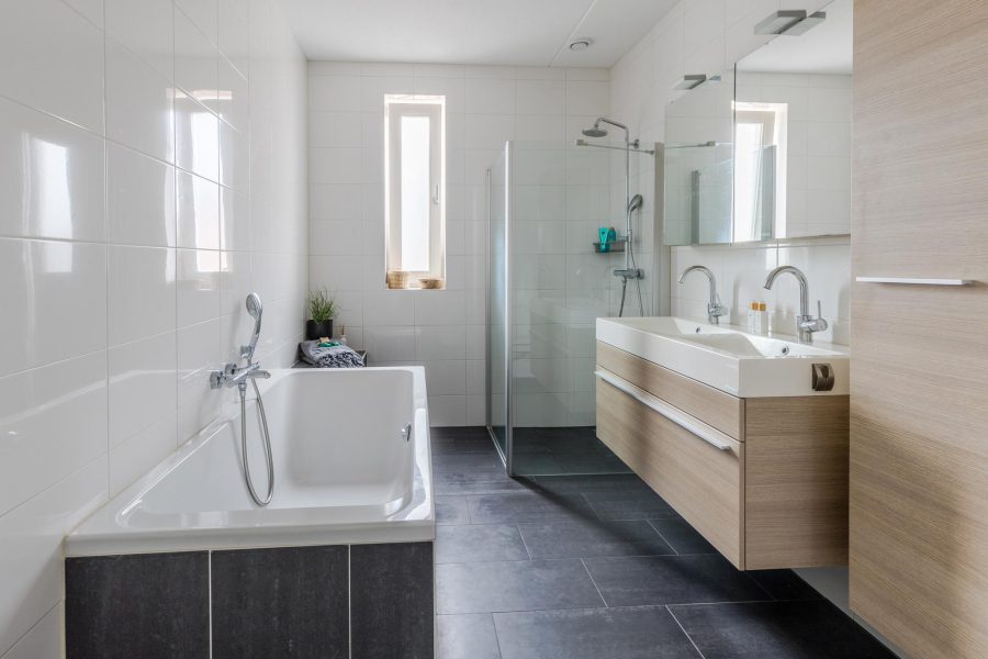 De royale badkamer heeft een centrale ligging op de eerste verdieping. Deze ruimte is fraai betegeld en uitgerust met een zwevend toilet, badmeubel met dubbele wastafel, ligbad en douchecabine.
