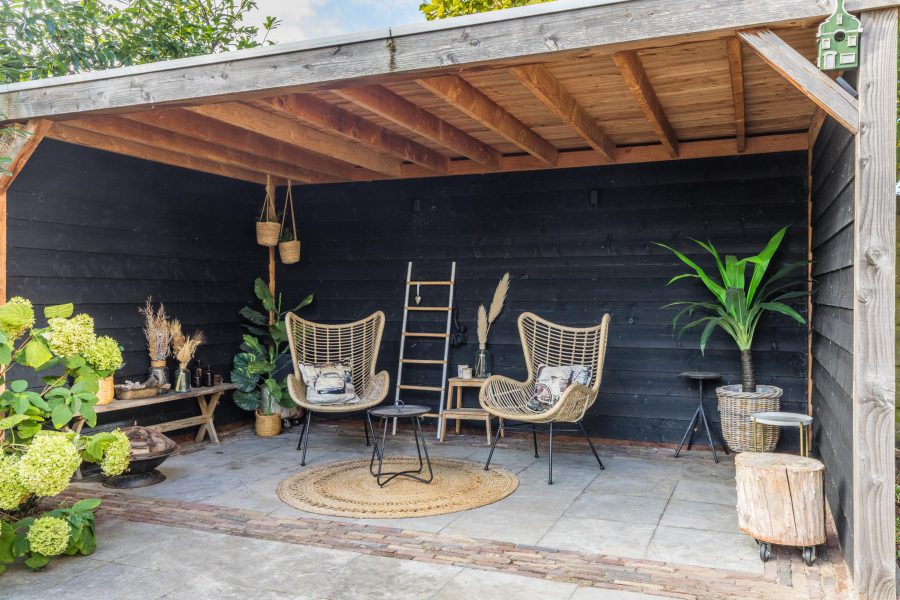 De achtertuin is voorzien van een grote, houten overkapping. Hieronder is mogelijk om overdekt te loungen. De tuin is rondom uitstekend beschut door schuttingen, waardoor je veel privacy ervaart.