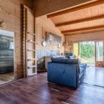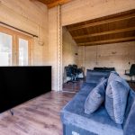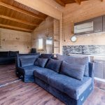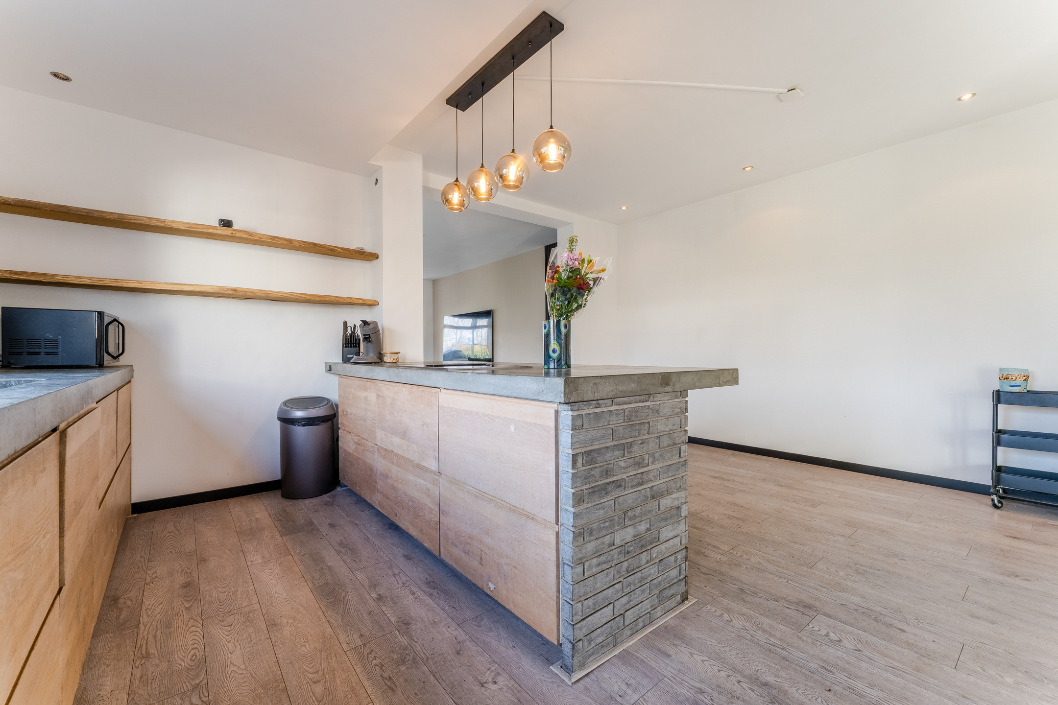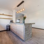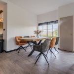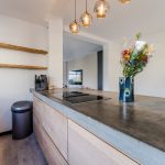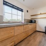 The modern kitchen (2020) consists of two kitchen units and a wall of cupboards. The whole has a beautiful design with wood-colored kitchen cabinets and gray countertops. The kitchen is equipped with the following high-quality appliances: dishwasher, induction stove with integrated extractor, oven, microwave, refrigerator and freezer. Next to the kitchen, there is space for a large dining table. This part of the house is lit with recessed spotlights.