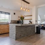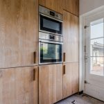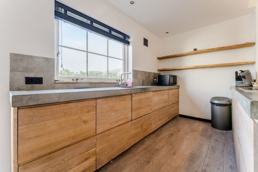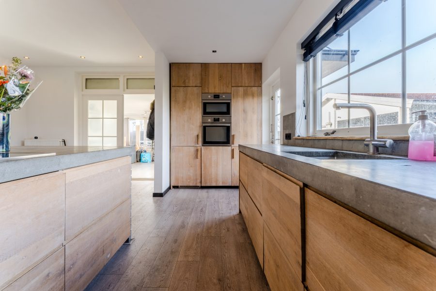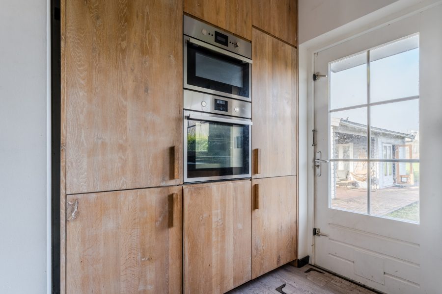 De moderne keuken (2020) bestaat uit twee keukenblokken en een kastenwand. Het geheel heeft een fraai design met houtkleurige keukenkastjes en grijze werkbladen. De keuken is uitgerust met de volgende hoogwaardige apparatuur: vaatwasser, inductie fornuis met geïntegreerde afzuiging, oven, magnetron, koelkast en vriezer. Naast de keuken is er ruimte voor een grote eettafel. Dit deel van het huis wordt verlicht met inbouwspots.
