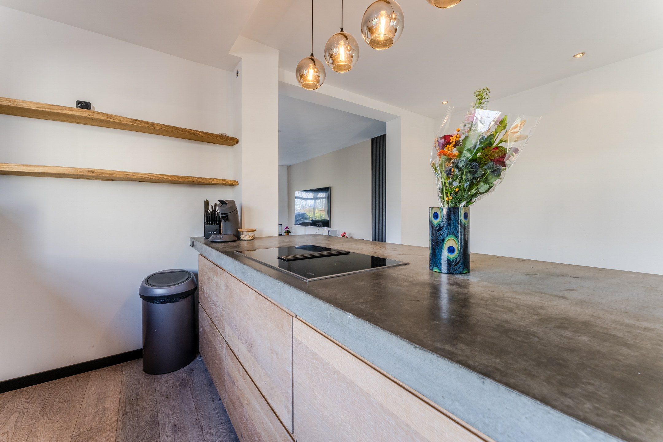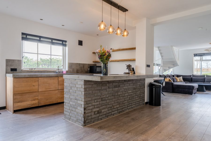 Via de loopbrug en ruime oprit bereik je de voordeur van deze mooie woning. Na binnenkomst sta je vrijwel direct in de open keuken.