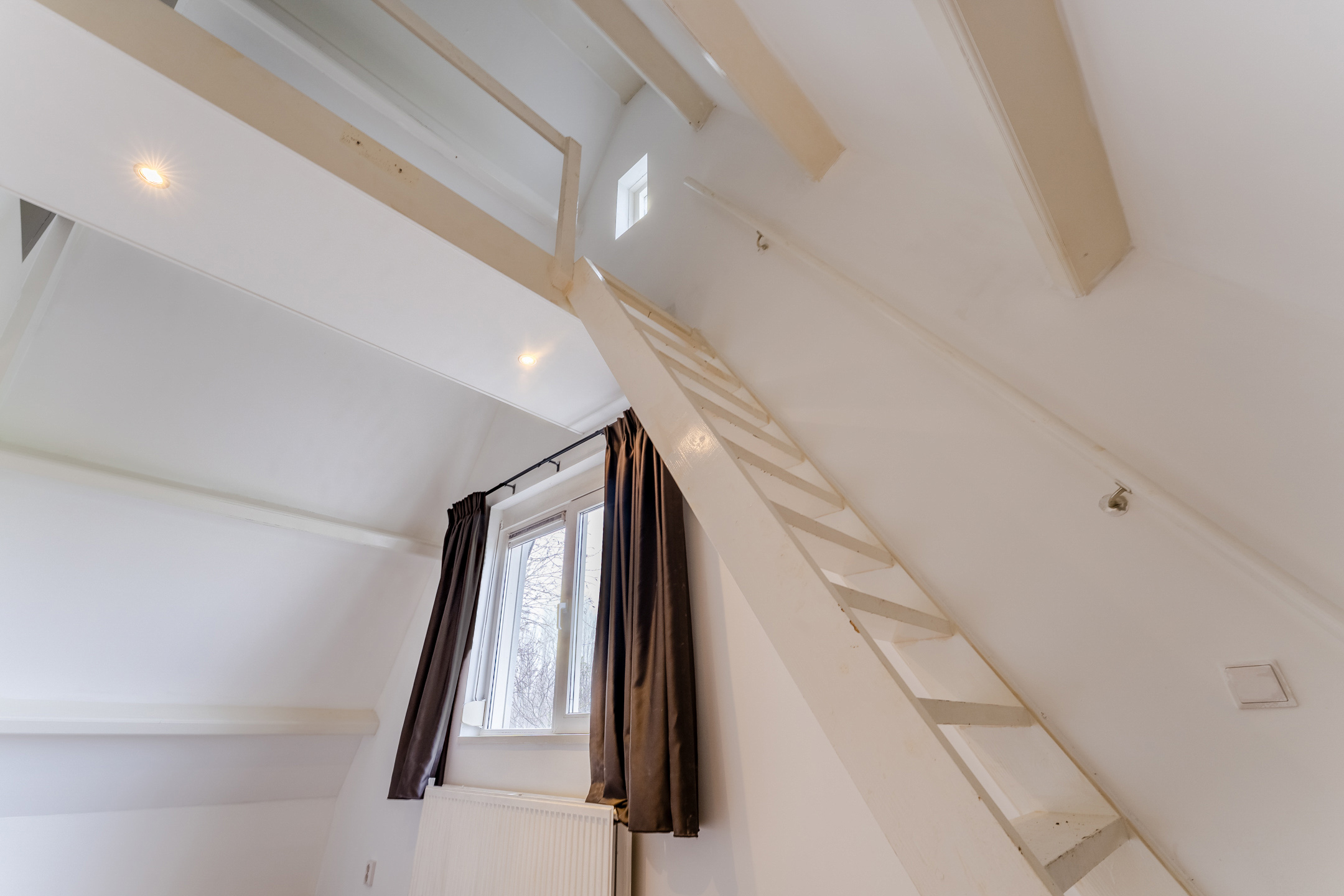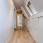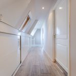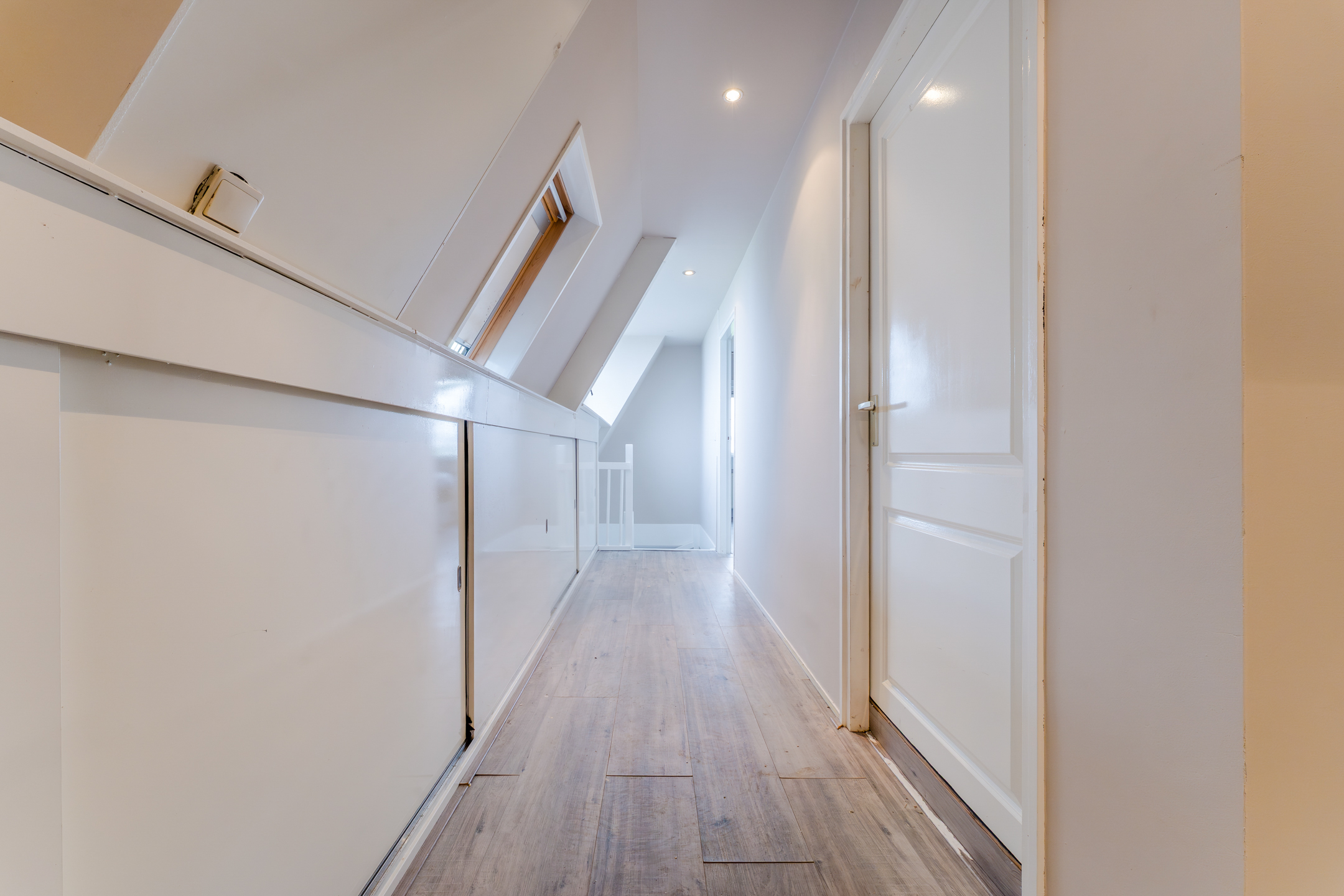 The stairs in the living room lead to the spacious landing on this floor. This landing is lit with recessed spotlights. From here you have access to several storage cupboards, the first three bedrooms and the bathroom. All bedrooms are spacious and have neat flooring and smooth walls. The light is also excellent throughout. The middle bedroom has a loft ladder to a storage loft. In the bedroom at the rear, there is a staircase leading to the loft, where a lounge area could be created.