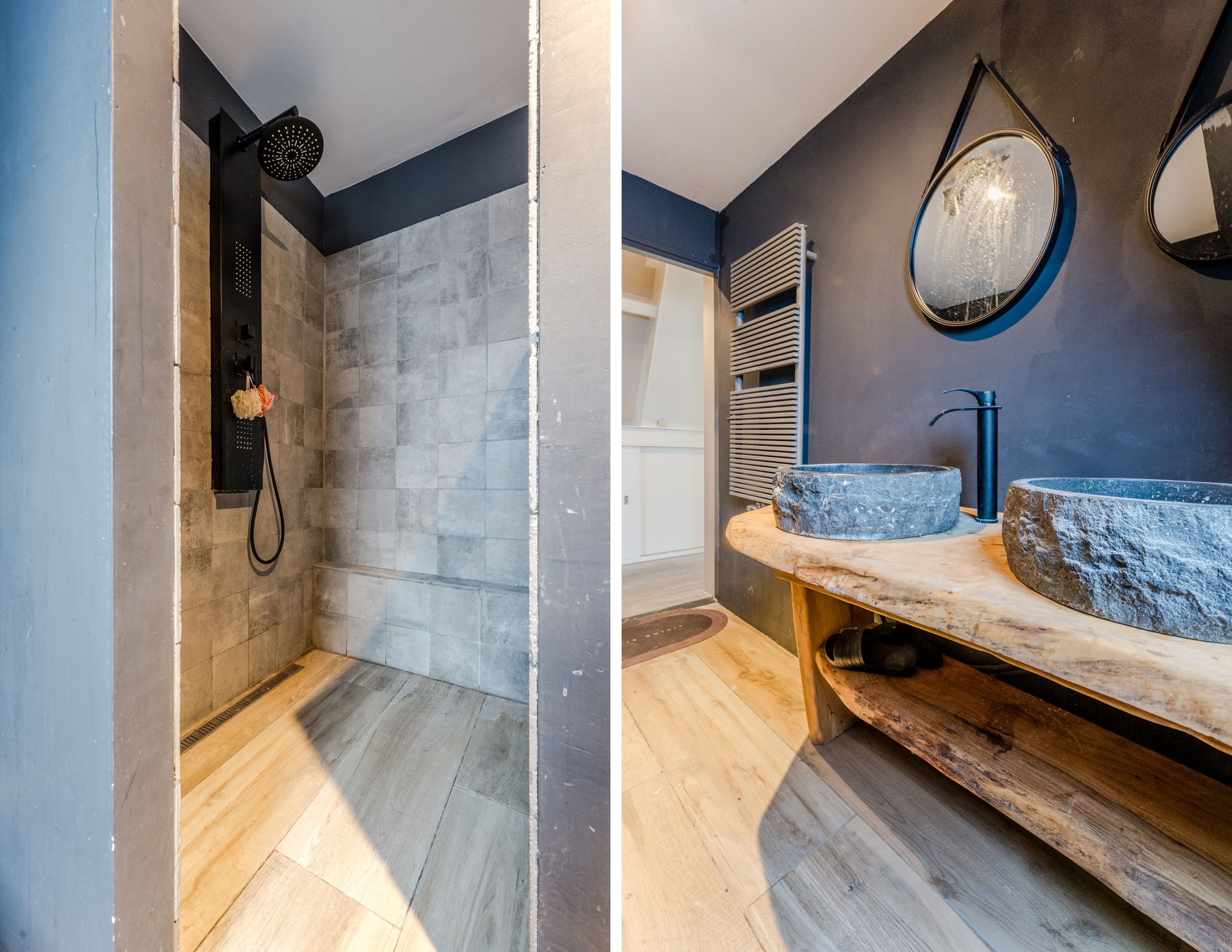 • Nette badkamer met toilet, dubbele wastafel en inloopdouche
