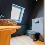 The spacious bathroom has a modern look and is equipped with a floating toilet, double sink and a walk-in shower with a luxurious shower panel.
