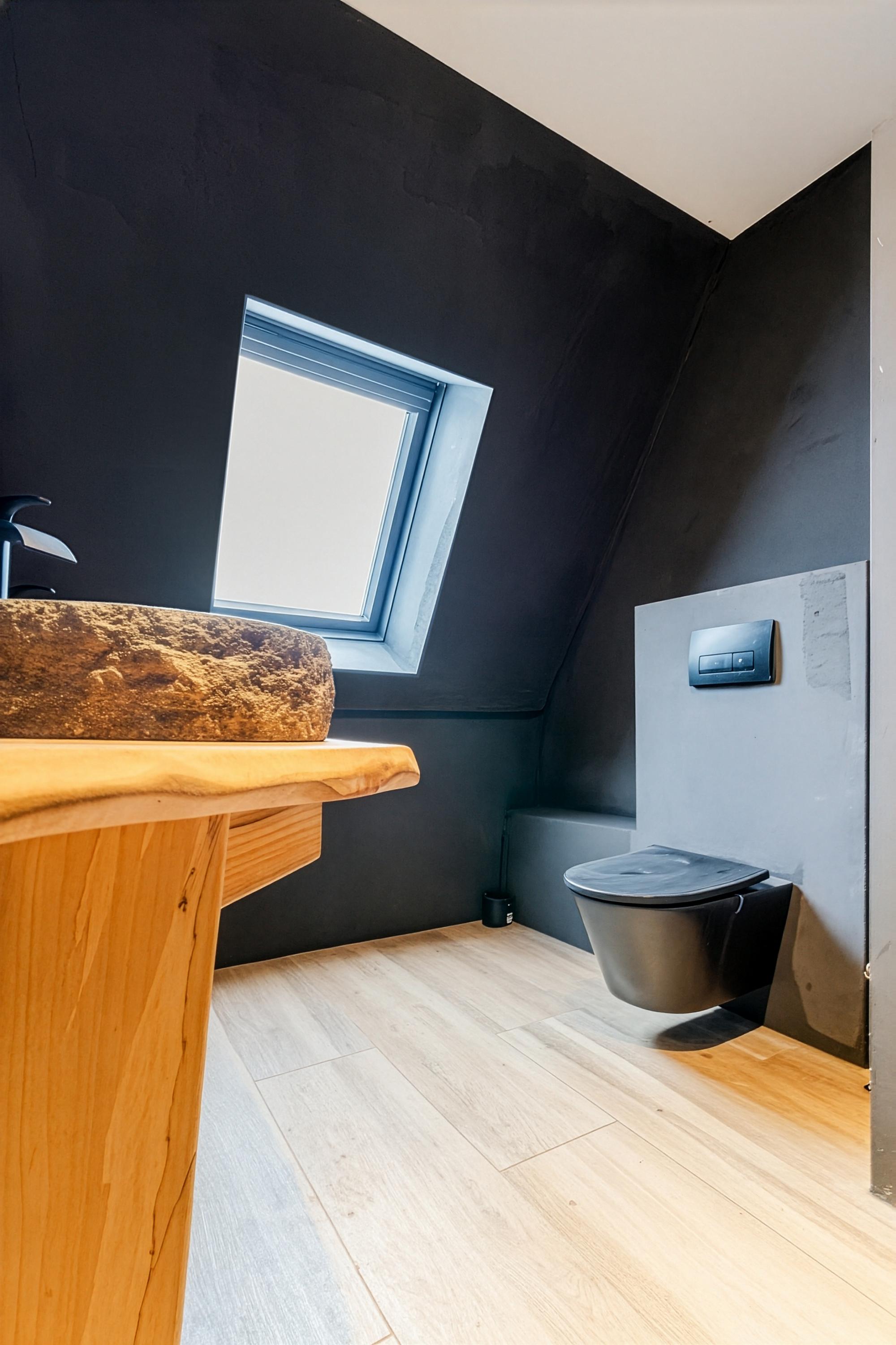 De ruime badkamer heeft een moderne uitstraling en is uitgerust met een zwevend toilet badmeubel met dubbele wastafel en een inloopdouche met luxe douchepaneel.